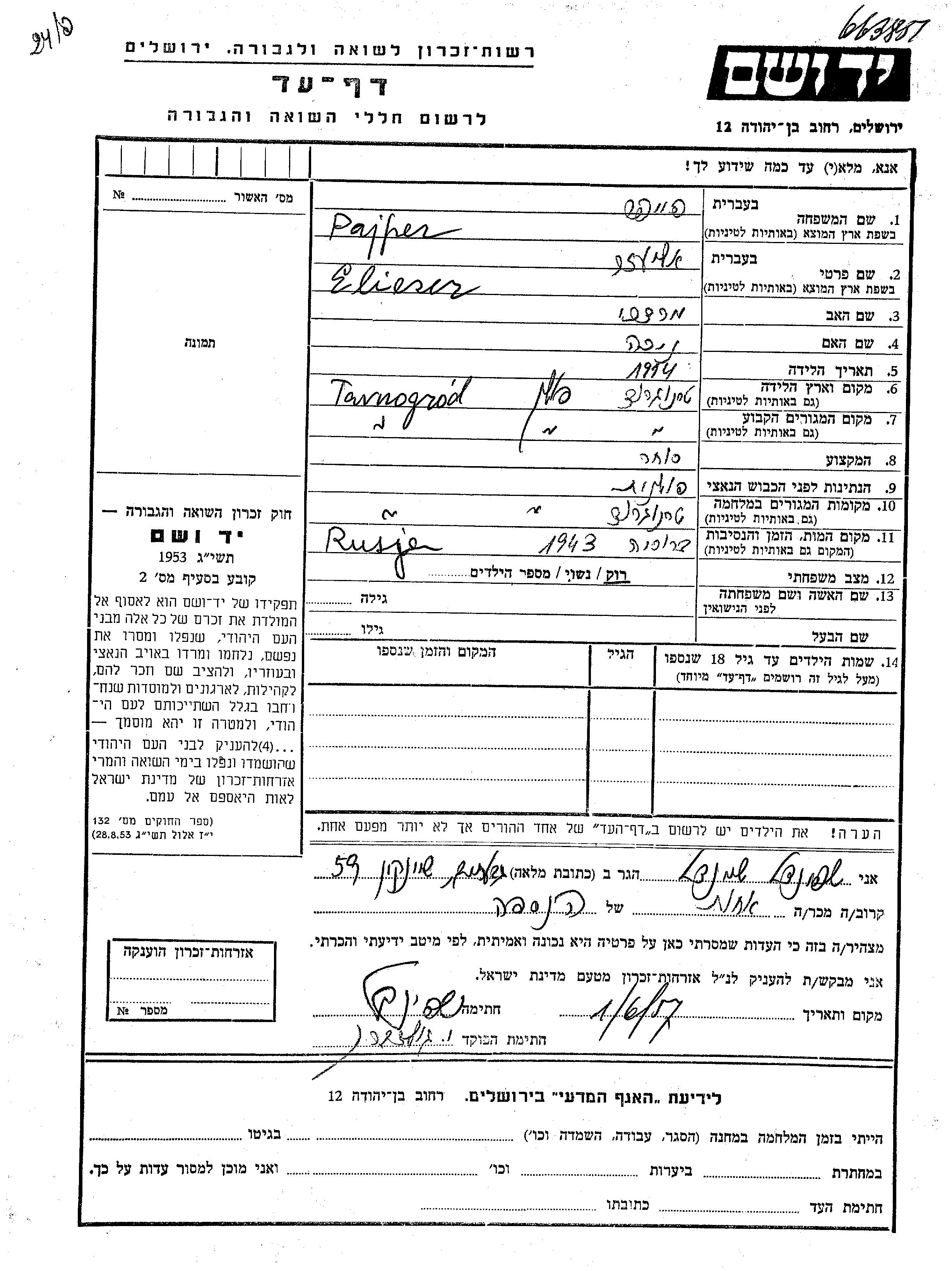 Eliezer wurde in der Schoah ermordet. Todesort: unbekannt im Jahr 1943.