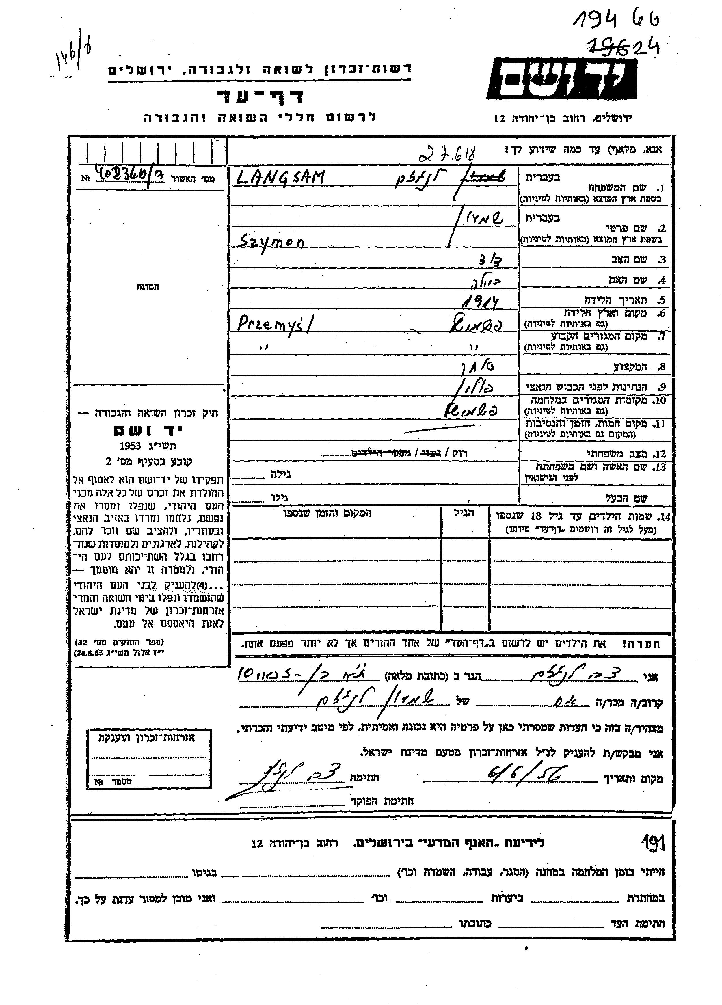 Shimon Langzam wurde im Jahr 1914 in Przemysl, Polen geboren. Er war Kaufmann/-frau. Vor dem Zweiten Weltkrieg lebte er in Przemysl, Polen.