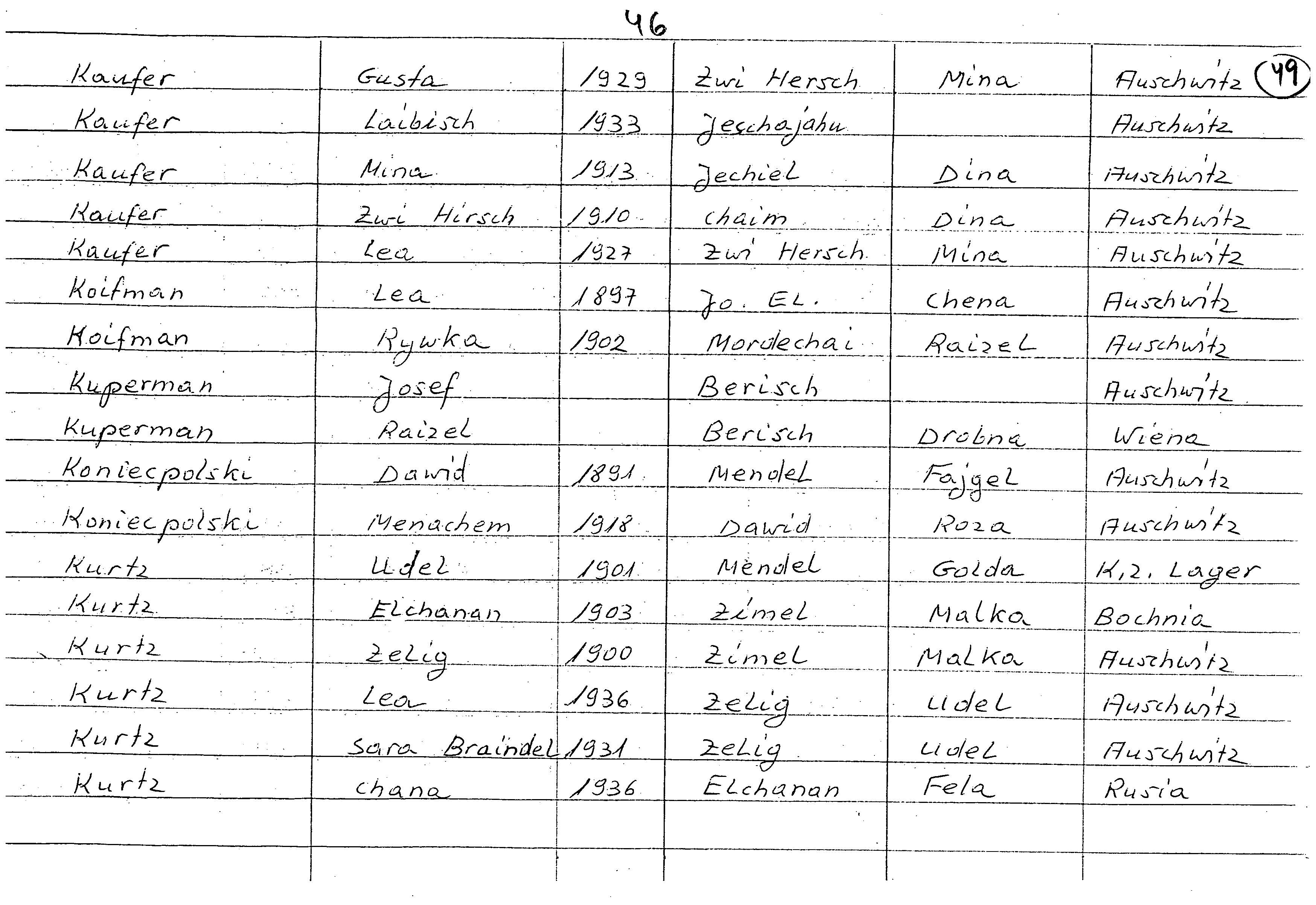 Adela Kurz, geb. Schlesinger wurde im Jahr 1901 in Chrzanow, Polen geboren. Sie war Hausfrau. Vor dem Zweiten Weltkrieg lebte sie in Chrzanow, Polen.