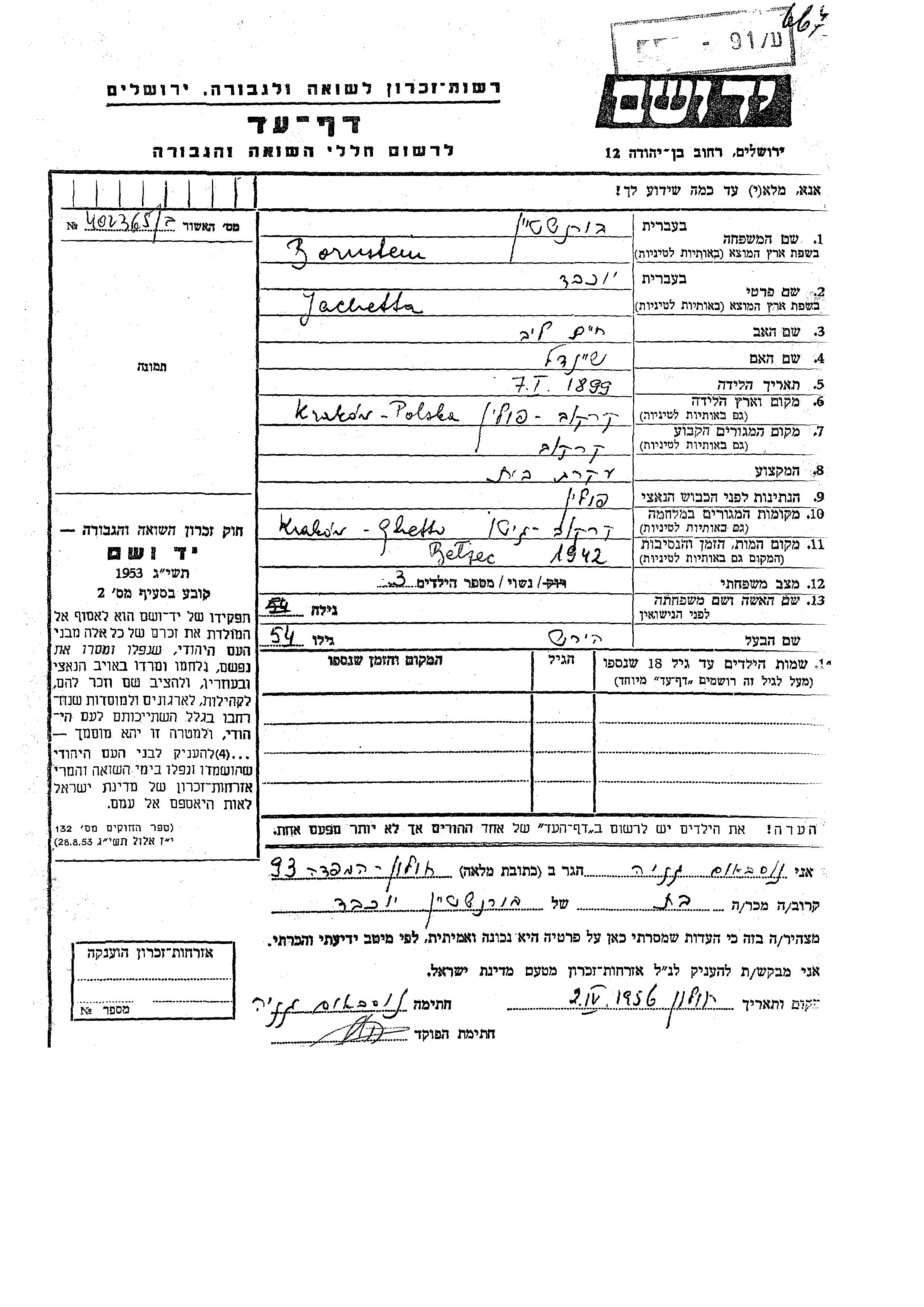 Yokheved Bornstein, geb. Rozenberg wurde im Jahr 1899 in Krakow, Polen geboren. Sie war Hausfrau. Vor dem Zweiten Weltkrieg lebte sie in Krakow, Polen.