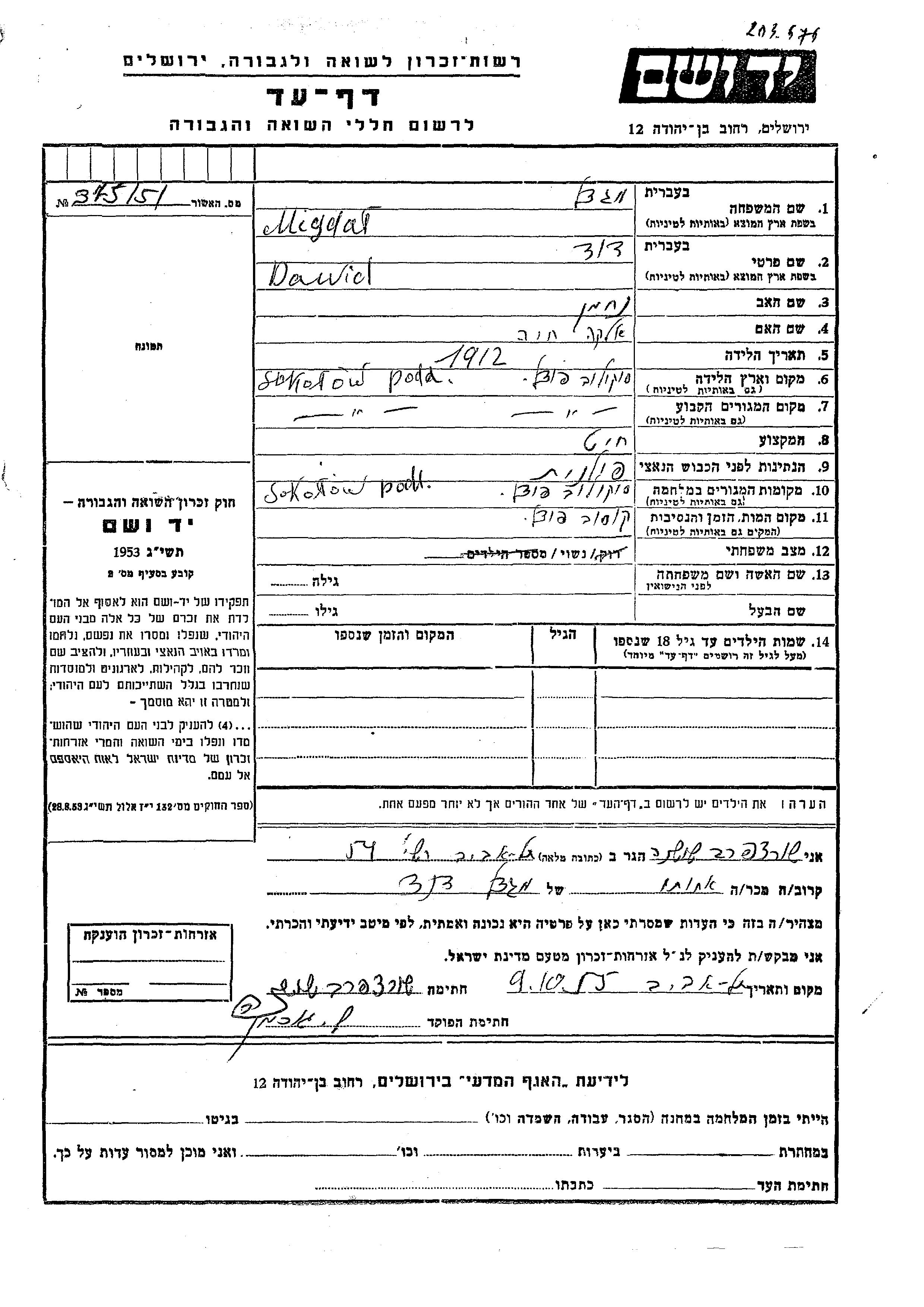 David Migdal wurde im Jahr 1912 in Sokolow Podlaski, Polen geboren. Er war Schneider. Vor dem Zweiten Weltkrieg lebte er in Sokolow Podlaski, Polen.