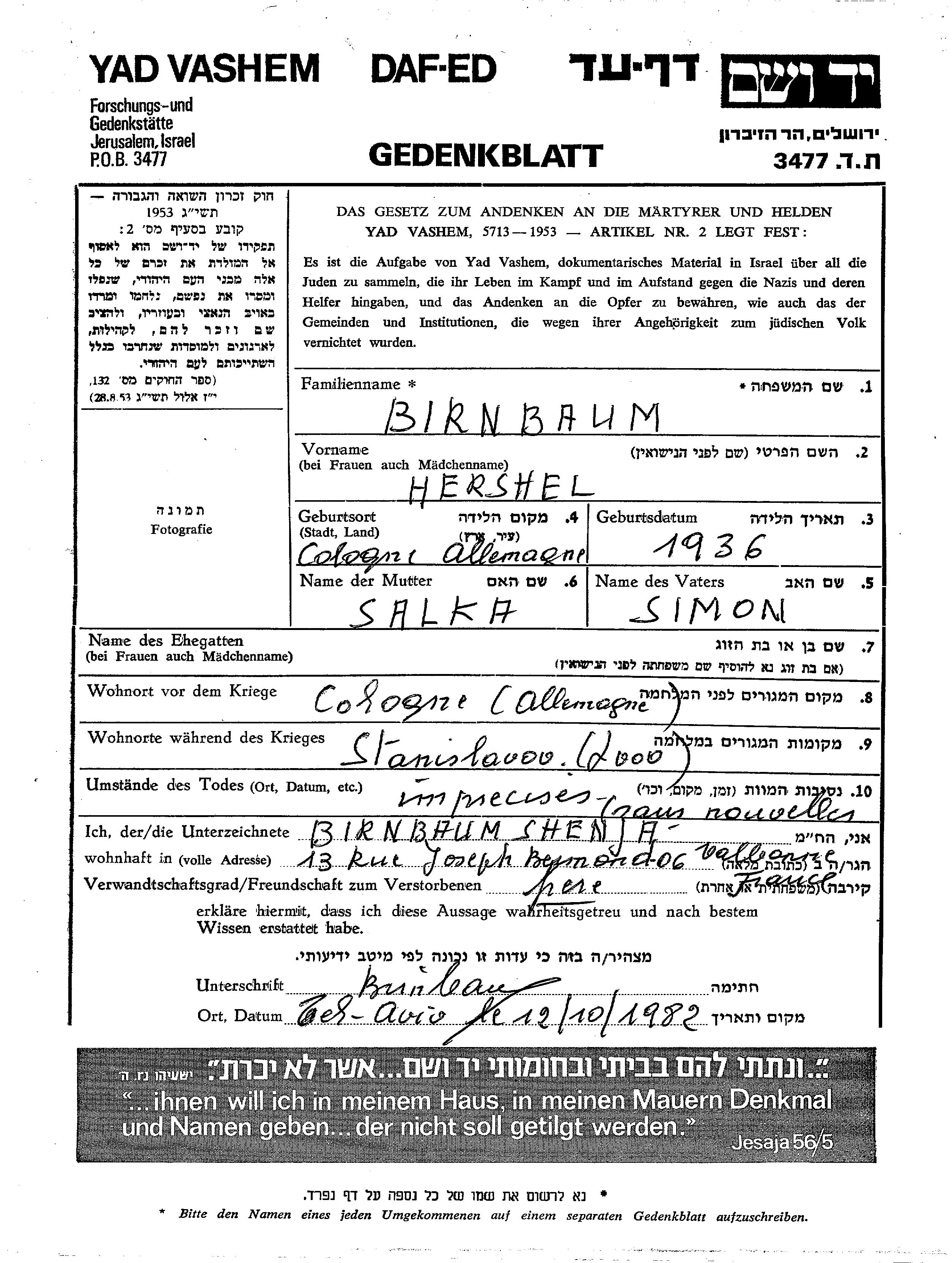 Birenbaum Schajke Herschel 1936 Cologne, Deutsches Reich Gedenkblatt
