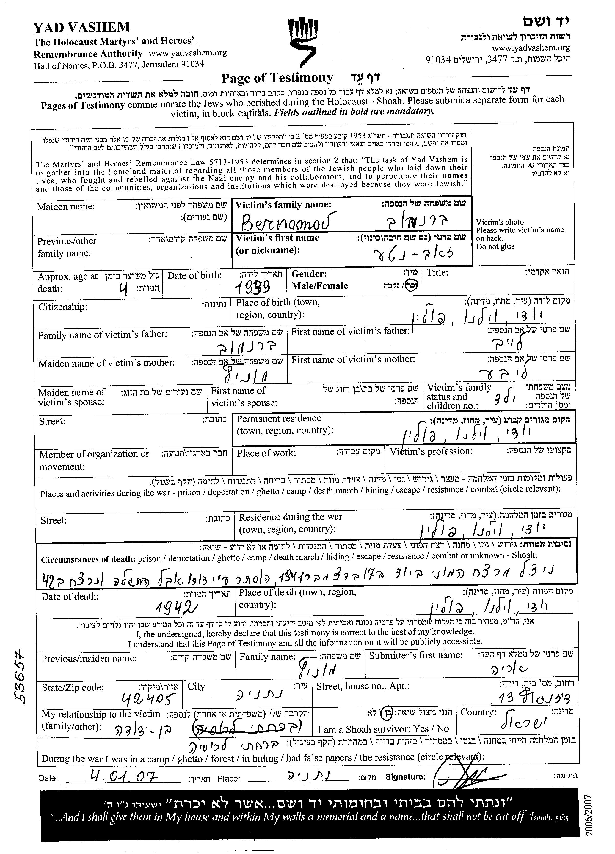 Zeev Nute Bernamow wurde im Jahr 1939 in Jody, Polen geboren. Vor dem Zweiten Weltkrieg lebte er in Jody, Polen.