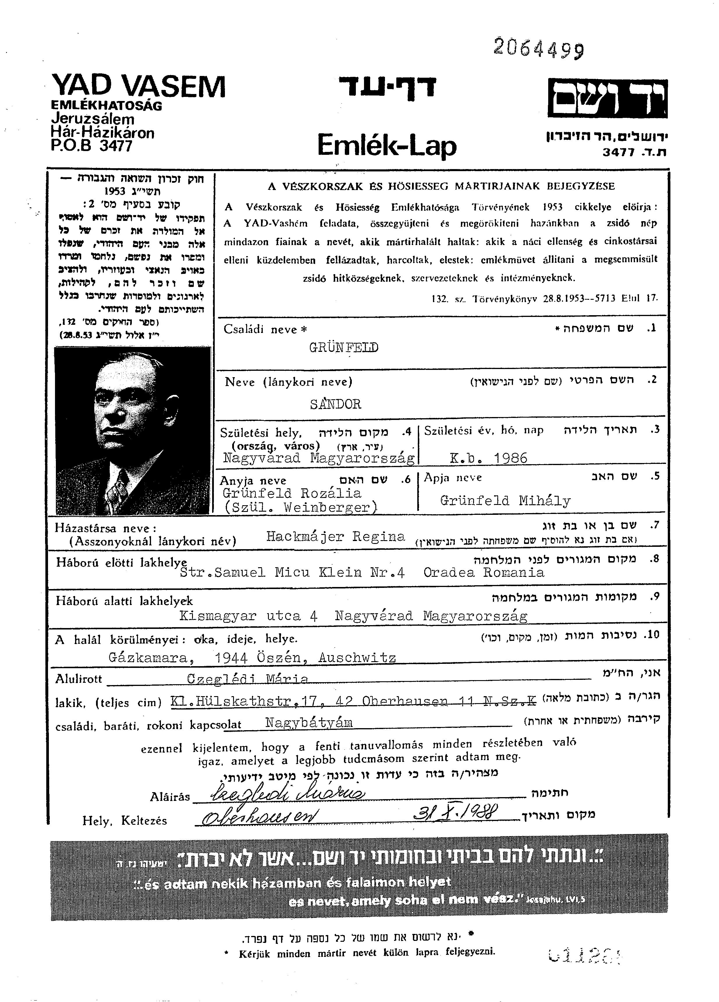 Grunfeld Sandor 1886 Nagyvarad, Rumänien Gedenkblatt