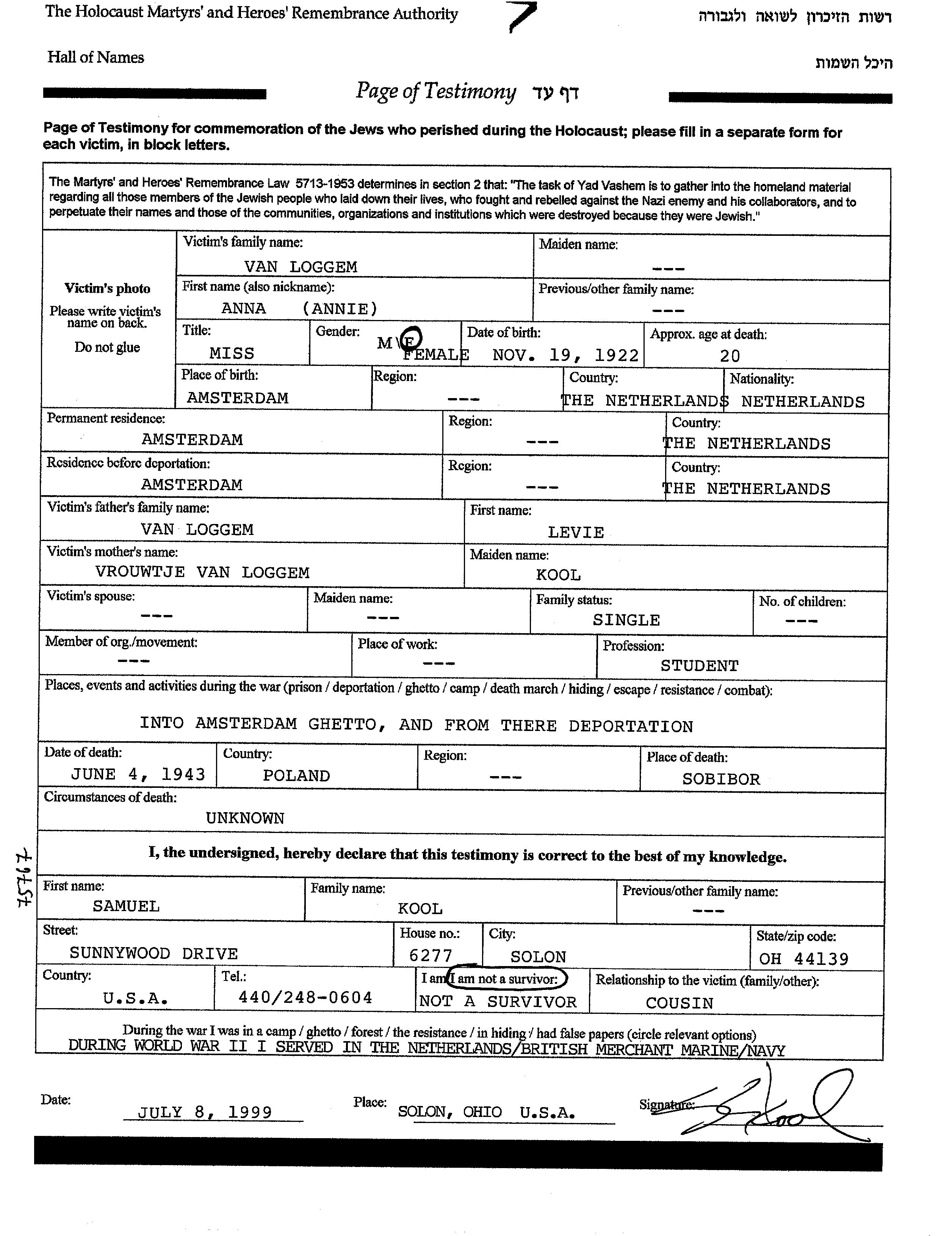 Annie Loggem van wurde im Jahr 1922 in Amsterdam, Niederlande geboren. Sie war Student. Vor dem Zweiten Weltkrieg lebte sie in Amsterdam, Niederlande.
