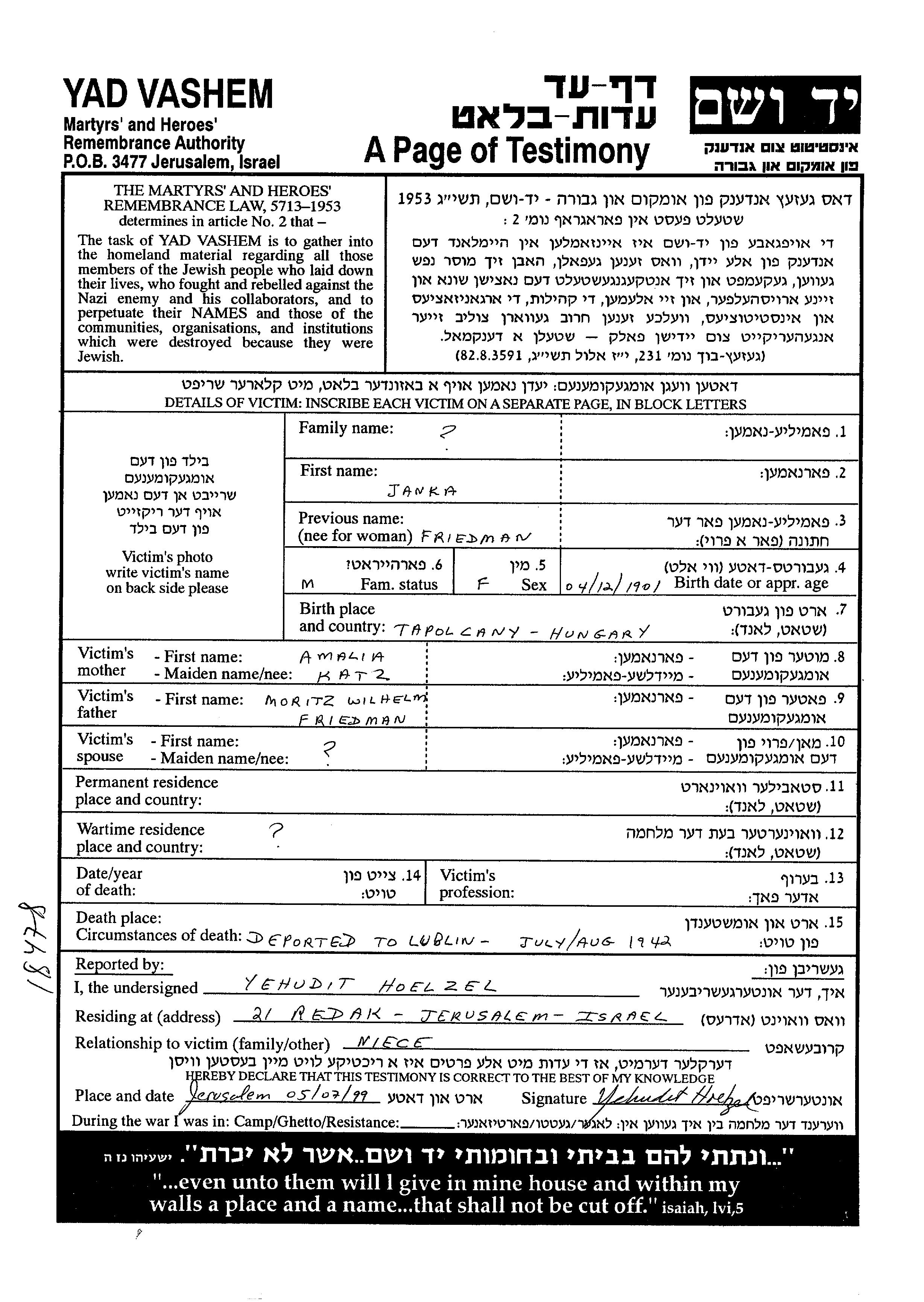 Janka Name unbekannt Friedmann, geb. Friedman wurde im Jahr 1901 in Tapolcany, Tschechoslowakei geboren. Vor dem Zweiten Weltkrieg lebte sie in Bratislava, Tschechoslowakei.