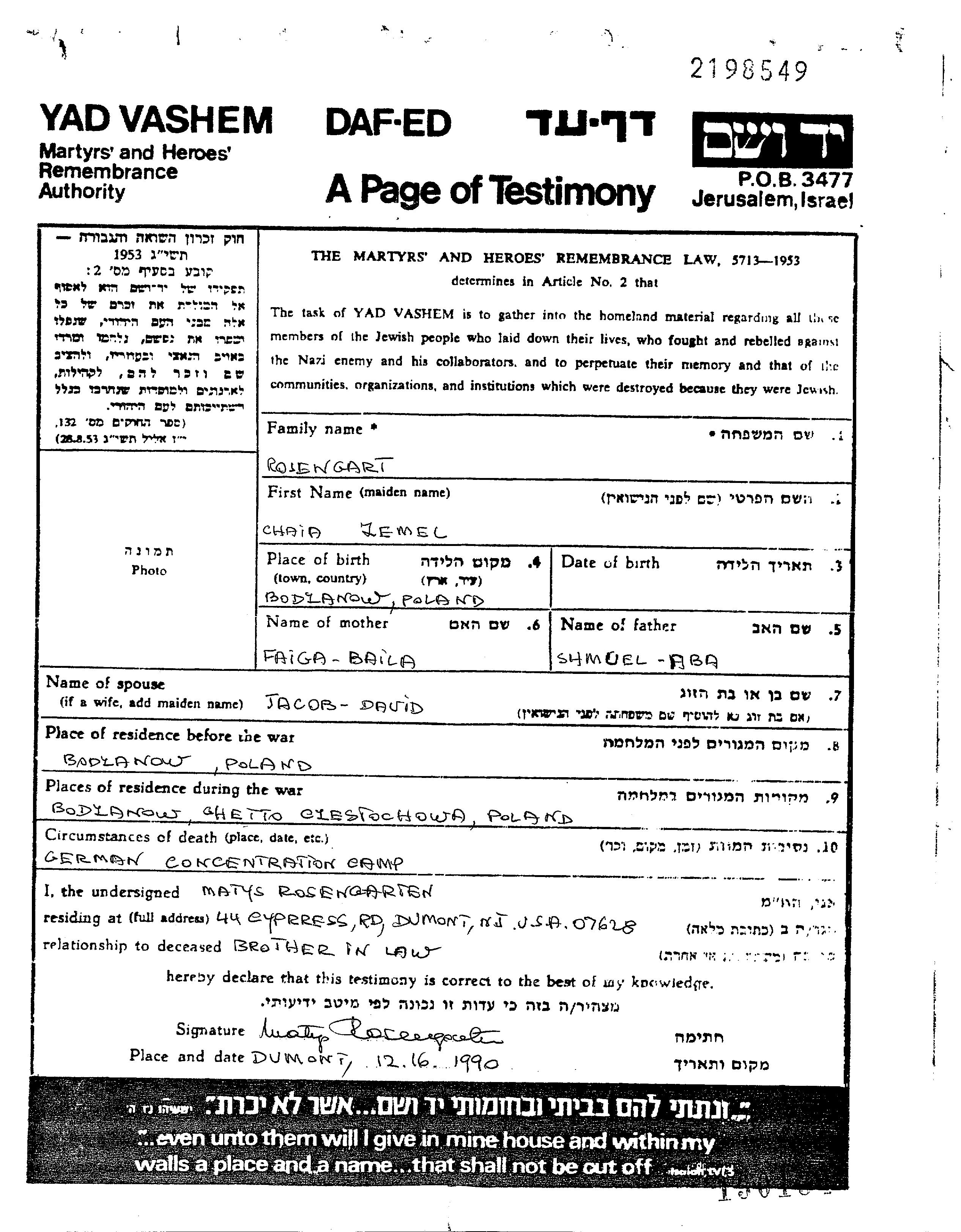 Rozengart Chaia 1913 Bodzanow, Polen Gedenkblatt
