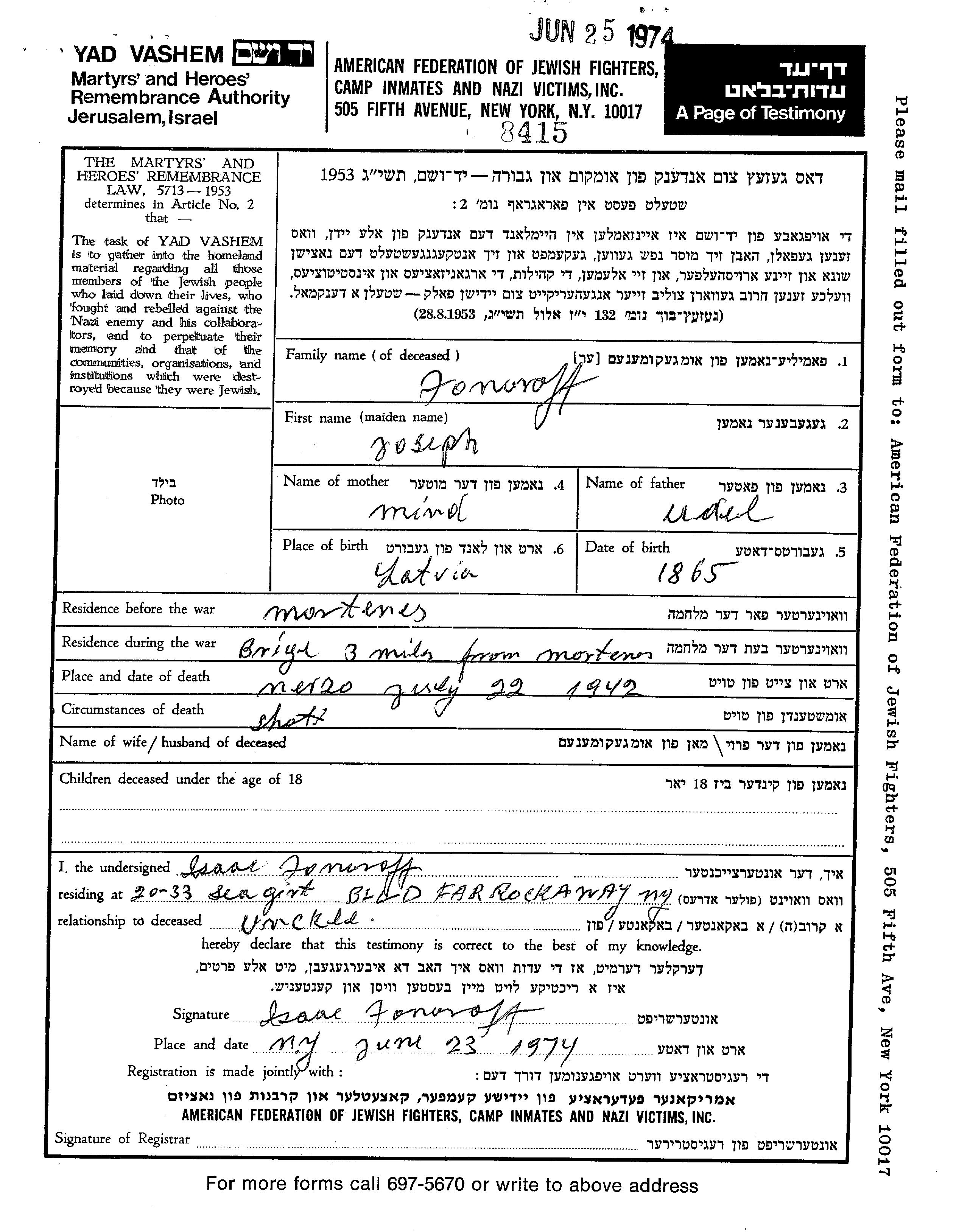 Joseph Fonaroff wurde im Jahr 1865 in Lettland geboren. Vor dem Zweiten Weltkrieg lebte er in Mortenes, Lettland.