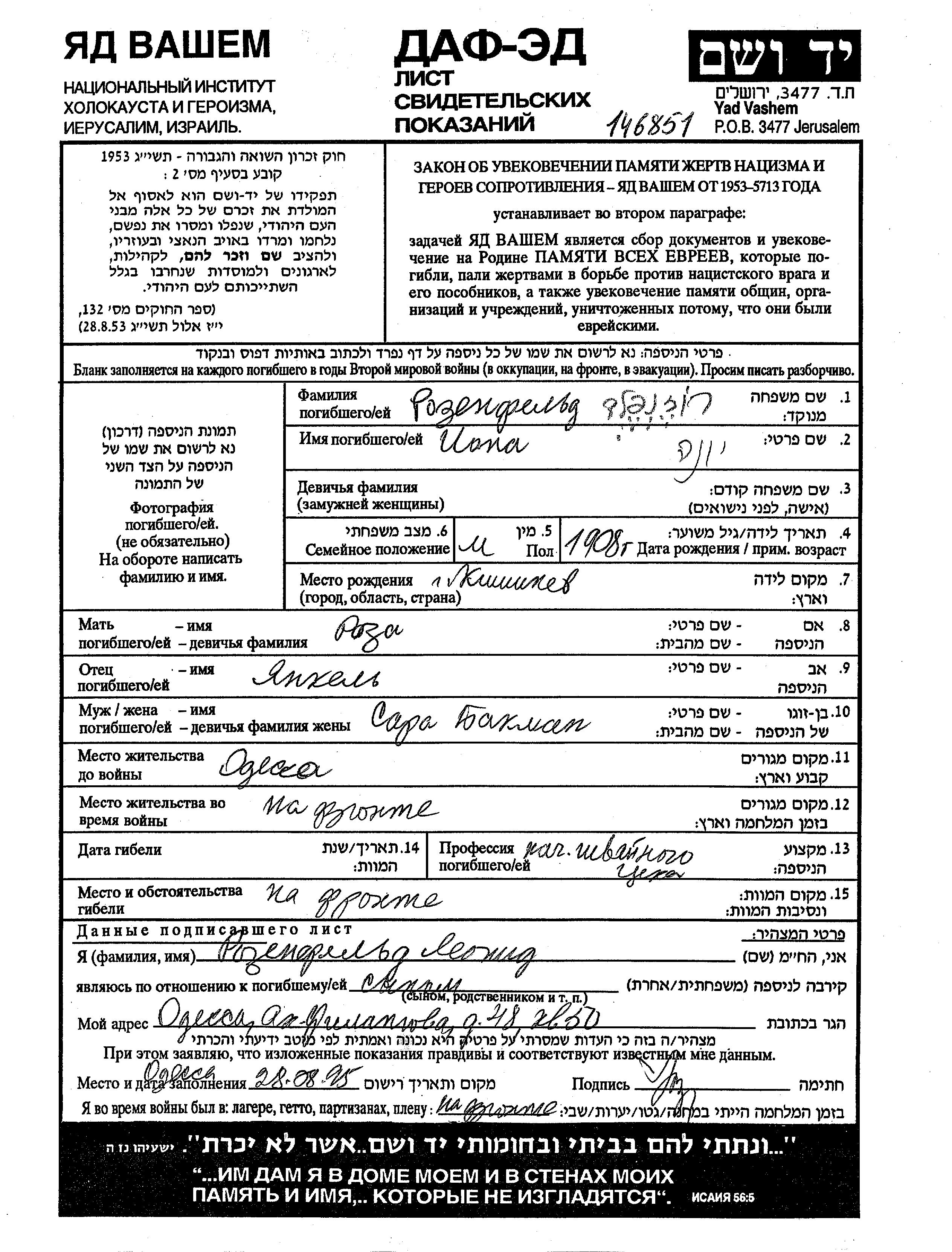 Yona Rozenfeld wurde im Jahr 1908 in Chisinau, Rumänien geboren. Vor dem Zweiten Weltkrieg lebte er in Odessa, Ukraine (UdSSR).