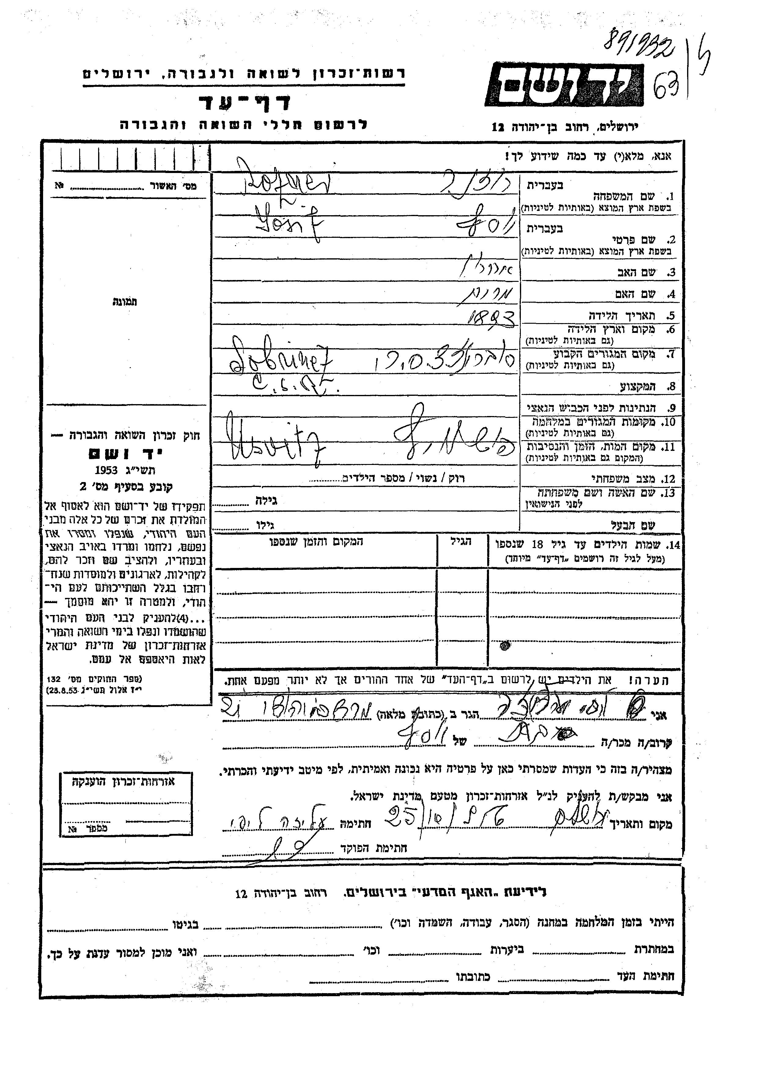 | Rozner | Yosif | 1893 | Sobrance, Tschechoslowakei | Gedenkblatt |