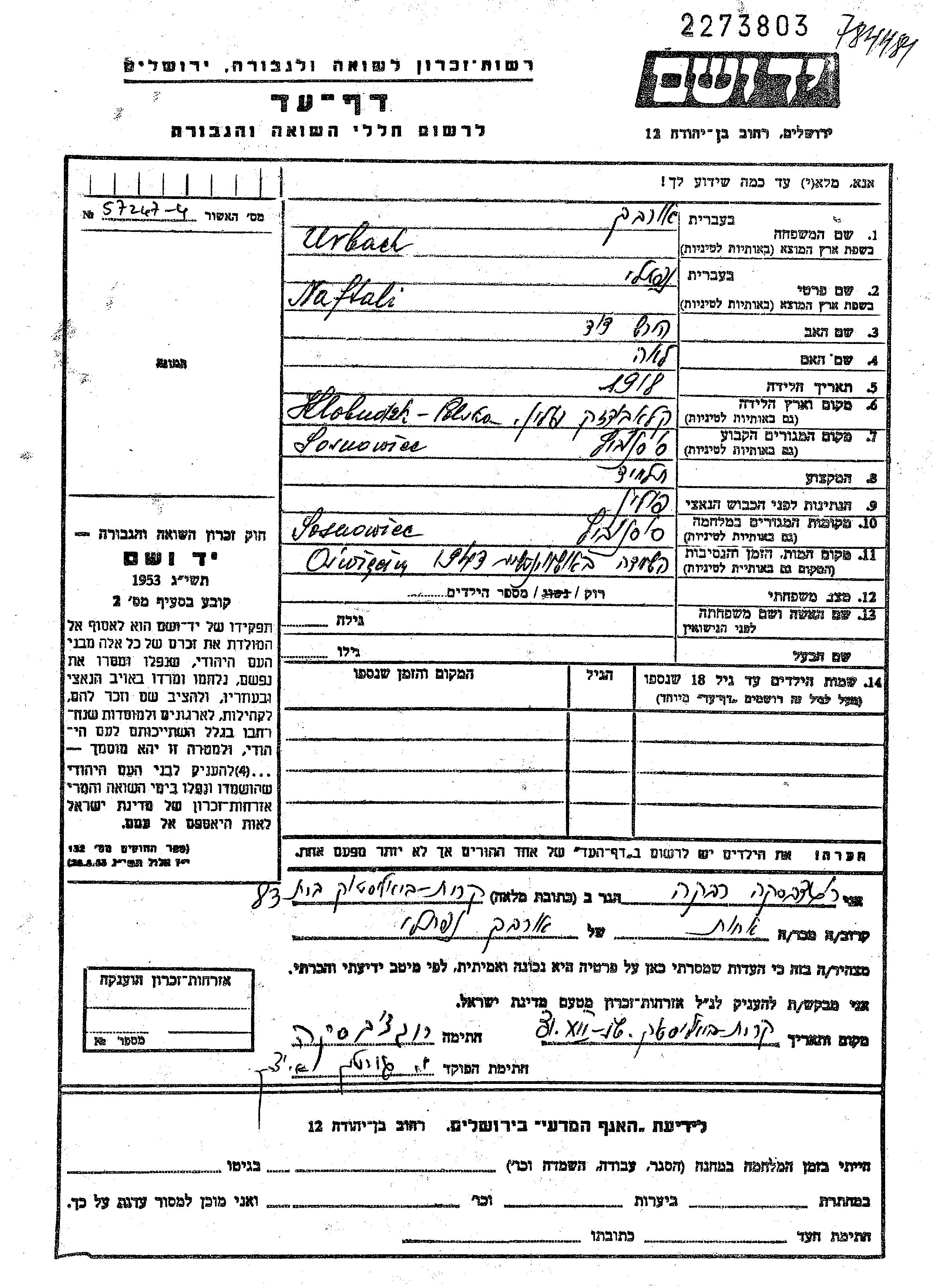 Naftali Urbakh wurde im Jahr 1918 in Klobuck, Polen geboren. Er war Schüler/-in. Vor dem Zweiten Weltkrieg lebte er in Sosnowiec, Polen.