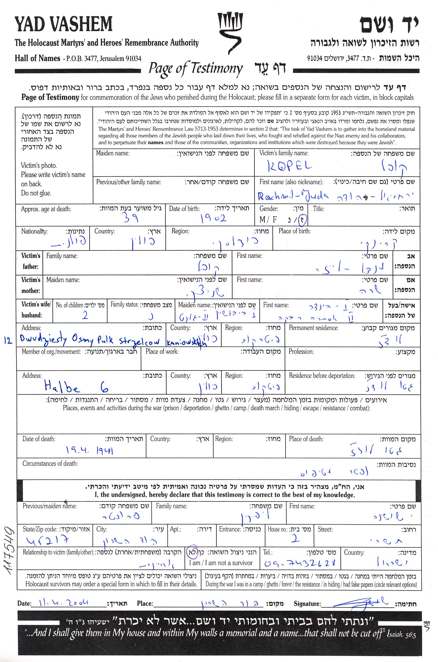 Kopel Rachmil Jehuda 1902 Lodz, Polen Gedenkblatt