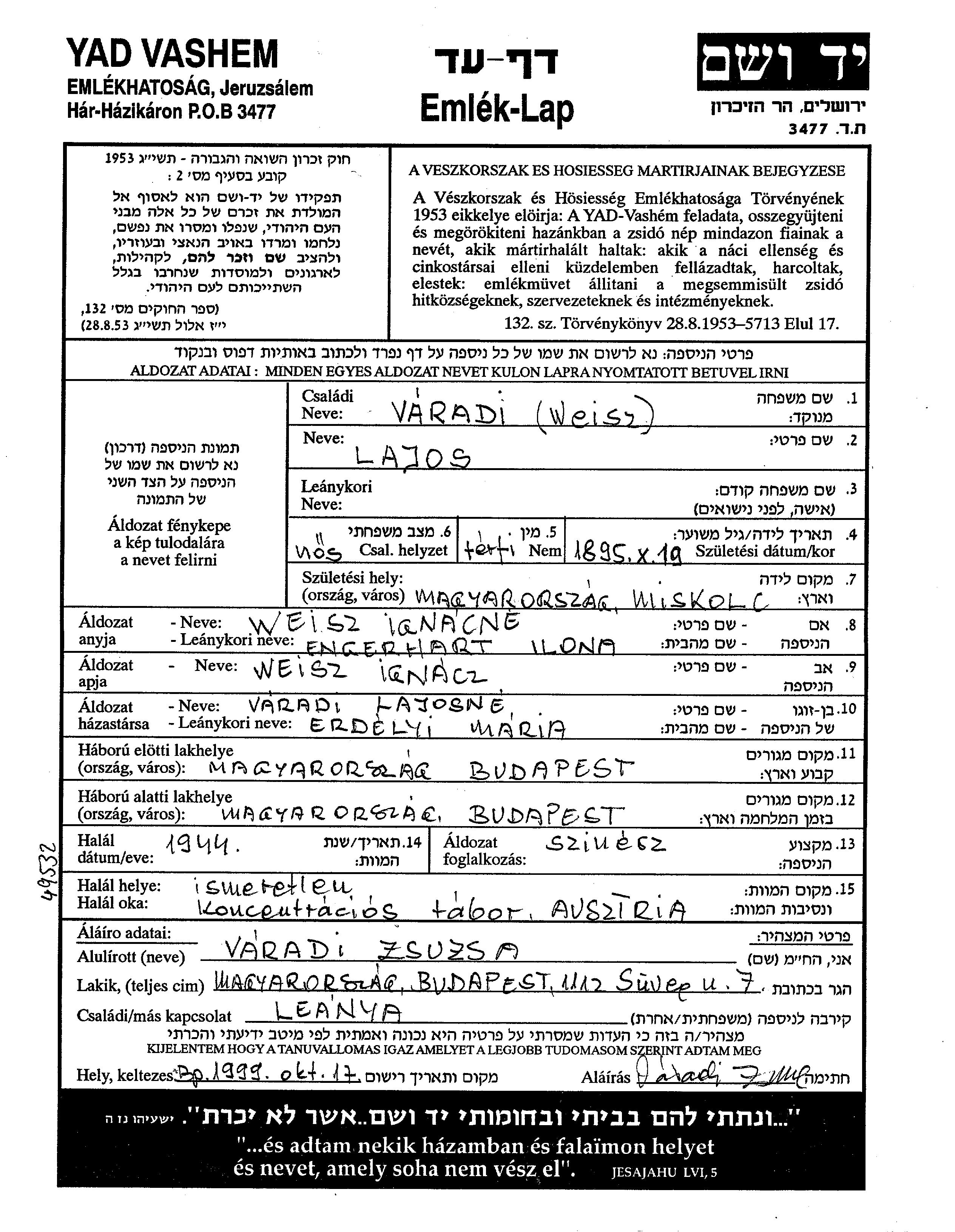 Varadi Weisz Lajos 1895 Budapest, Ungarn Gedenkblatt