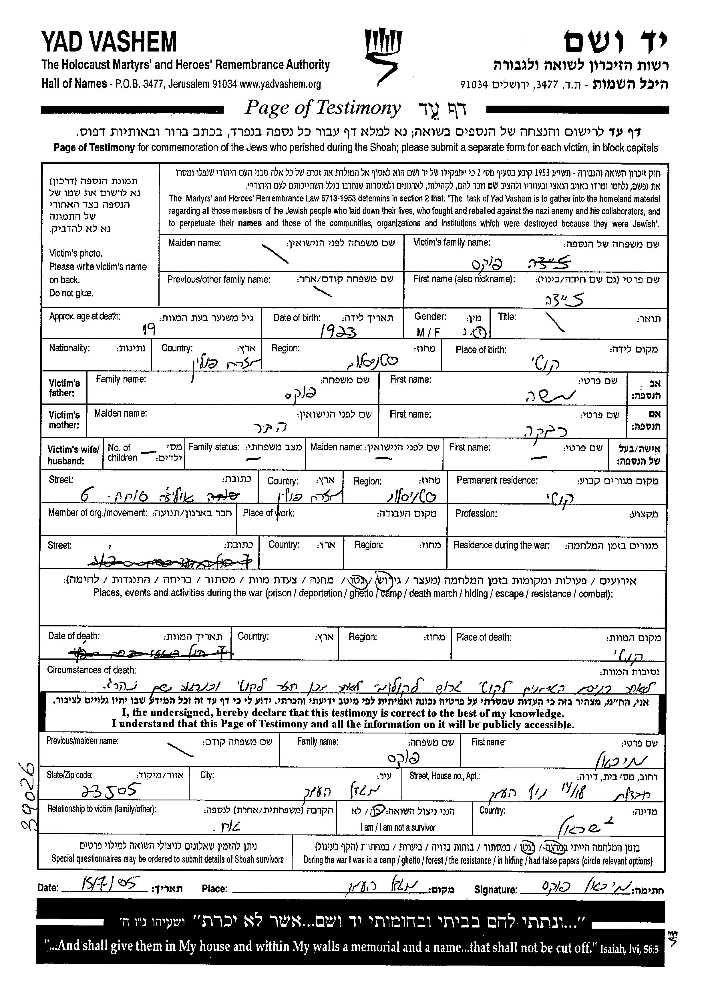 Zeide wurde in der Schoah ermordet. Todesort: Kuty, Polen im Jahr 07/04/1942.