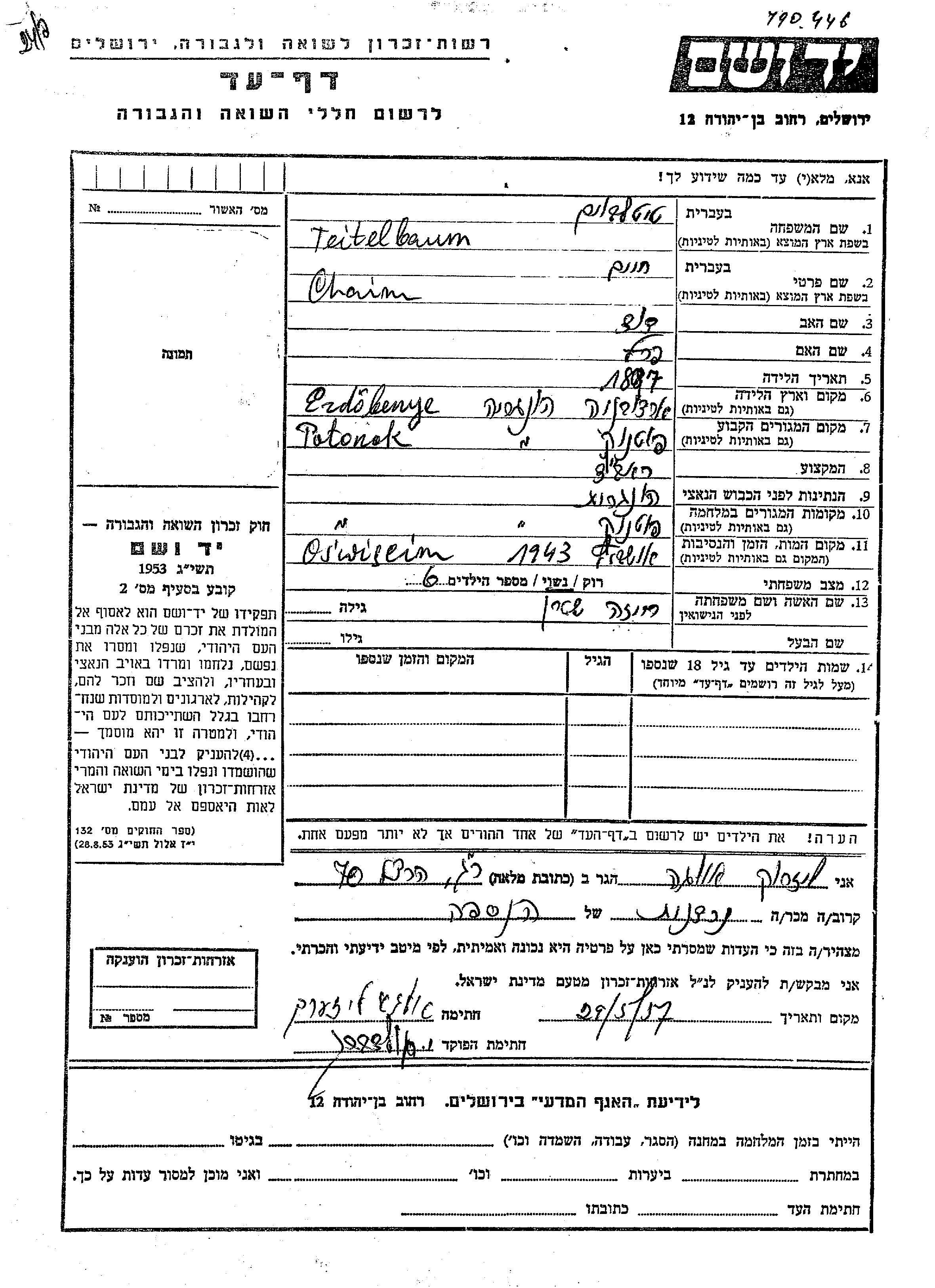 Khaim Teitelbaum wurde im Jahr 1897 in Erdobenye, Ungarn geboren. Vor dem Zweiten Weltkrieg lebte er in Potnok, Ungarn.