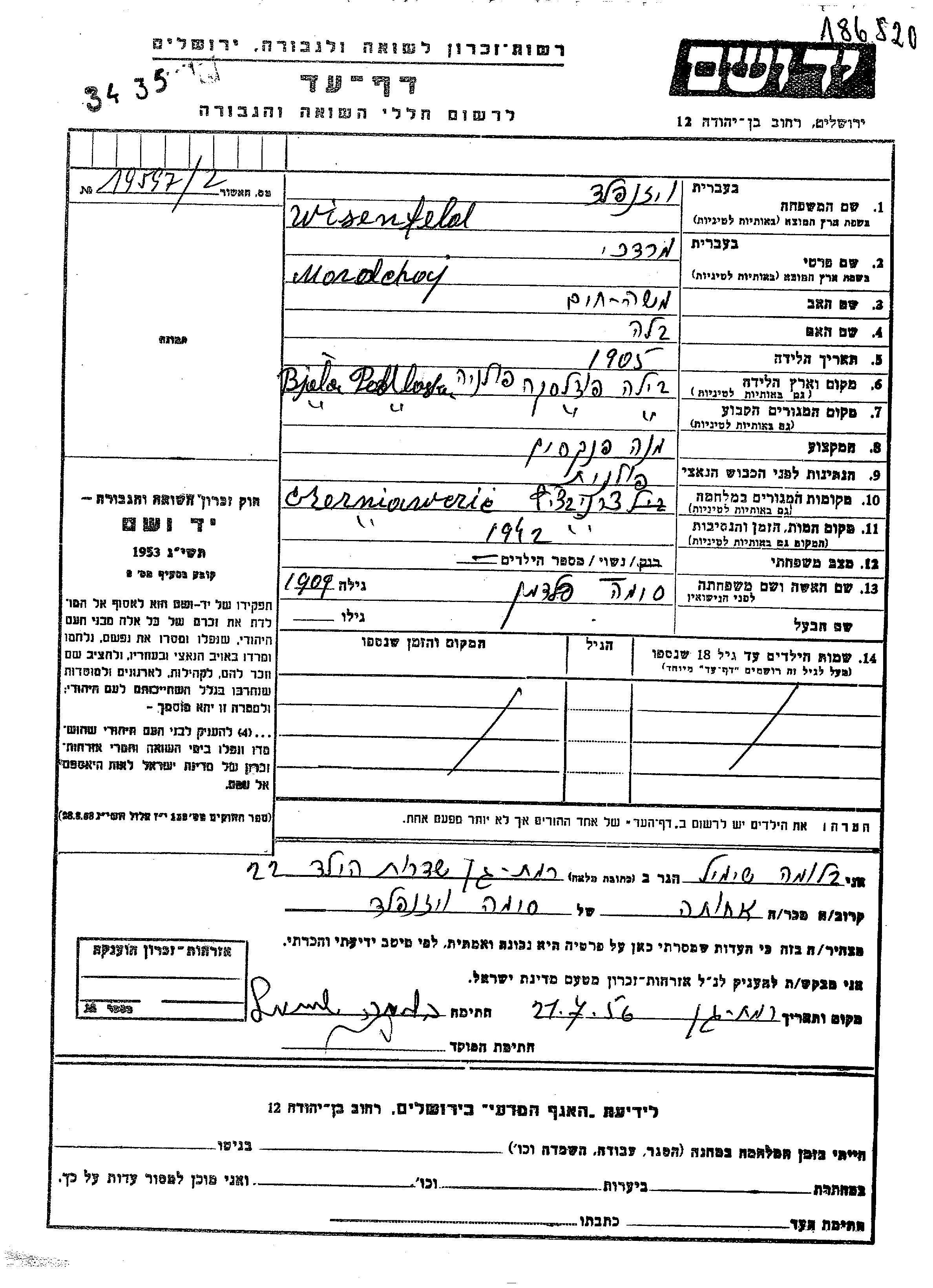 Wizenfeld Mordchaj 1905 Biala Podlaska, Polen Gedenkblatt