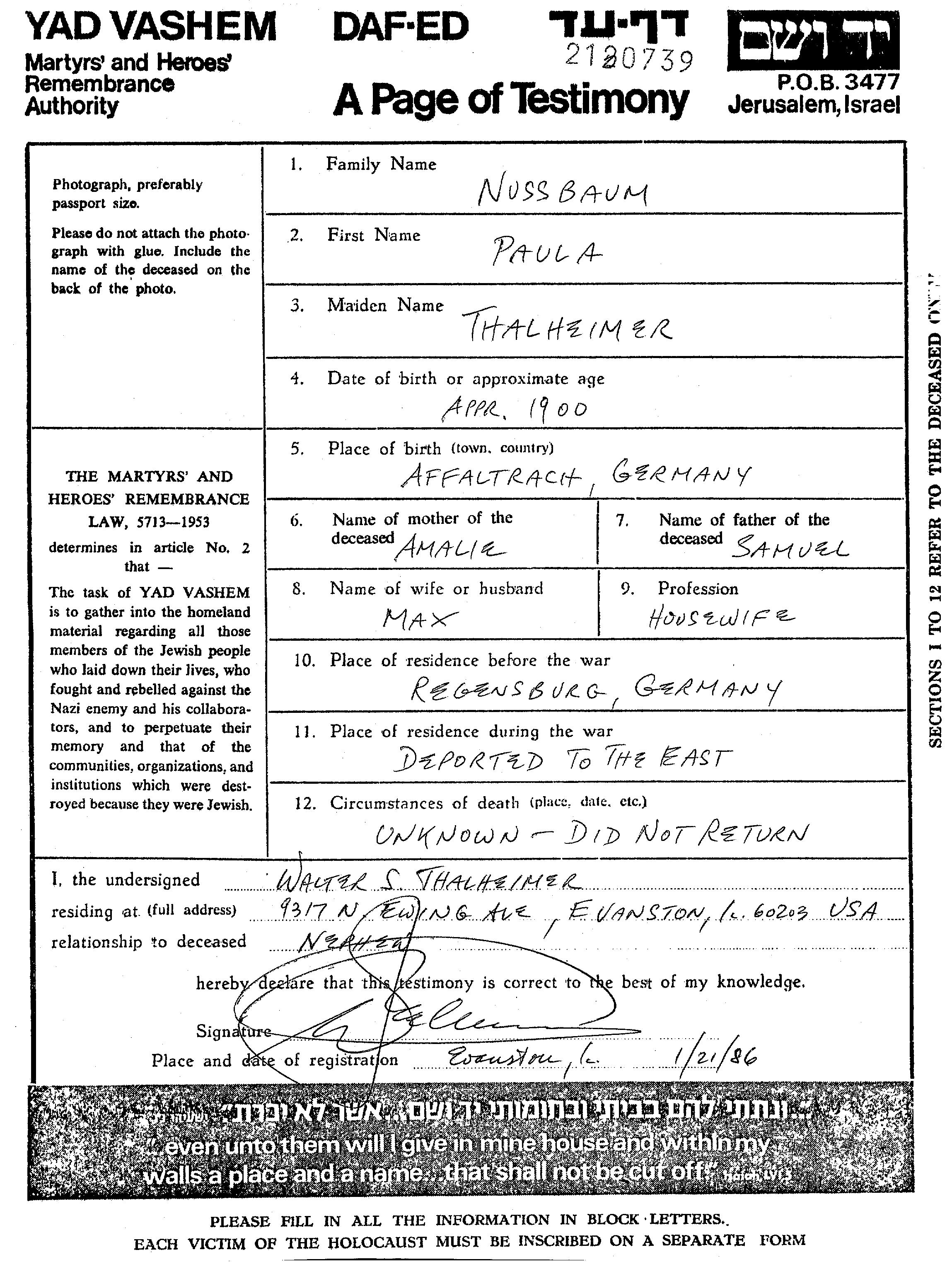 Paula Nußbaum, geb. Thalheimer wurde im Jahr 1900 in Affaltrach, Deutsches Reich geboren. Vor dem Zweiten Weltkrieg lebte sie in Regensburg, Deutsches Reich.