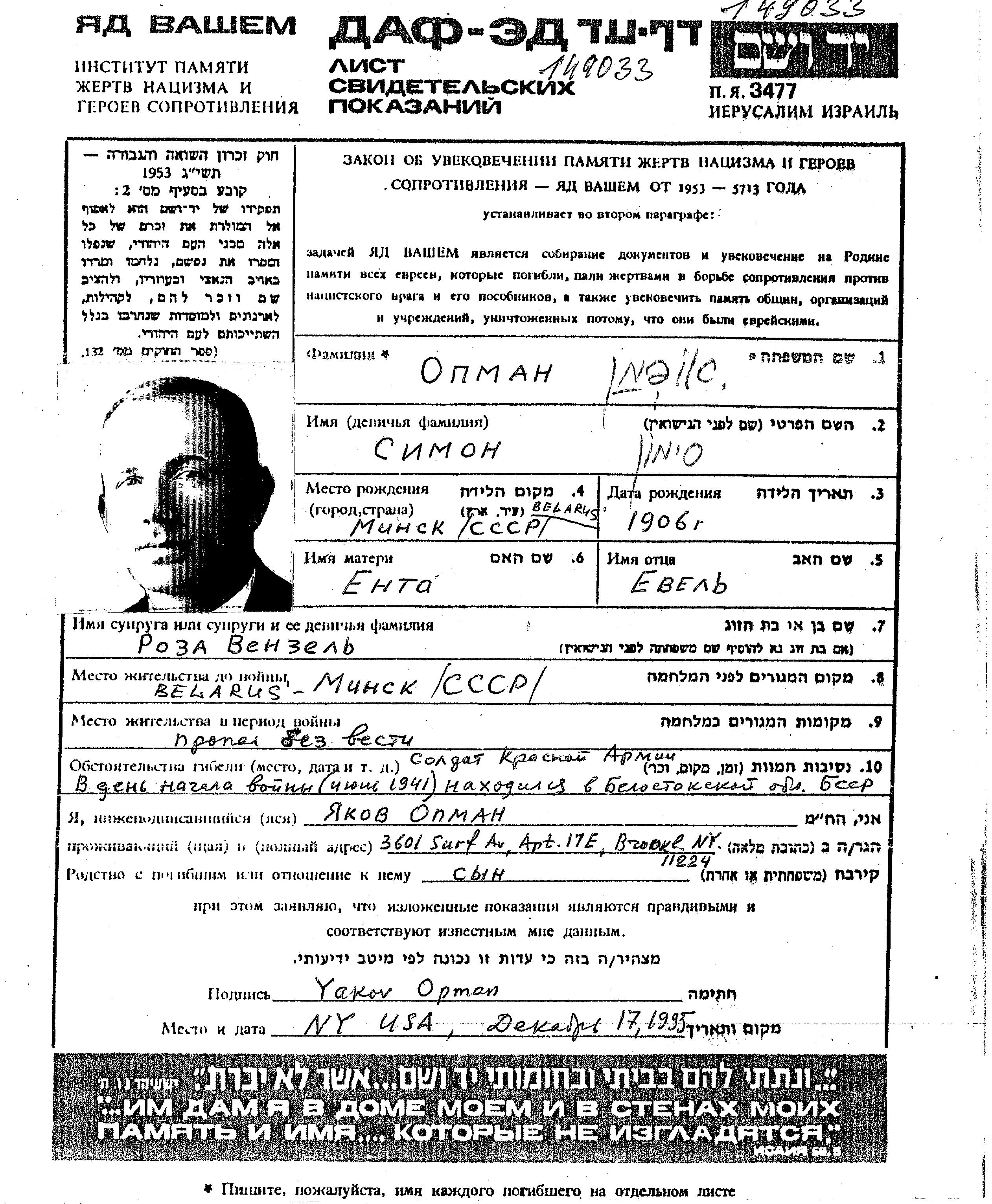 Ofman Simon 1906 Minsk, Weißrussland (UdSSR) Gedenkblatt