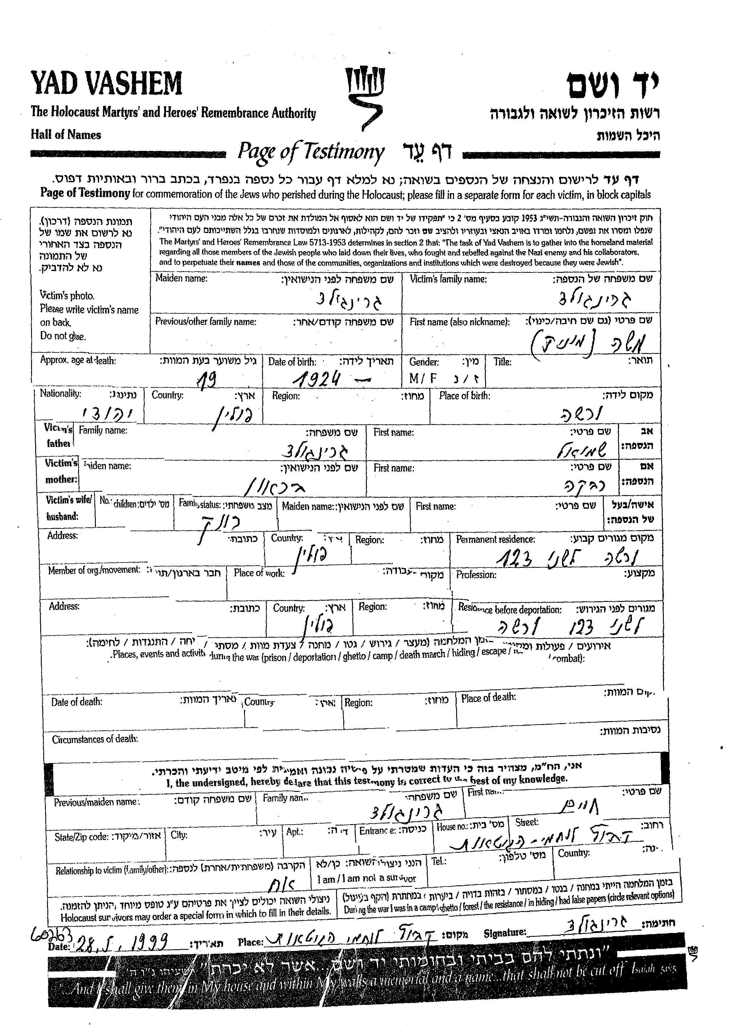 Gringold Moshe Monik 1924 Warszawa, Polen Gedenkblatt