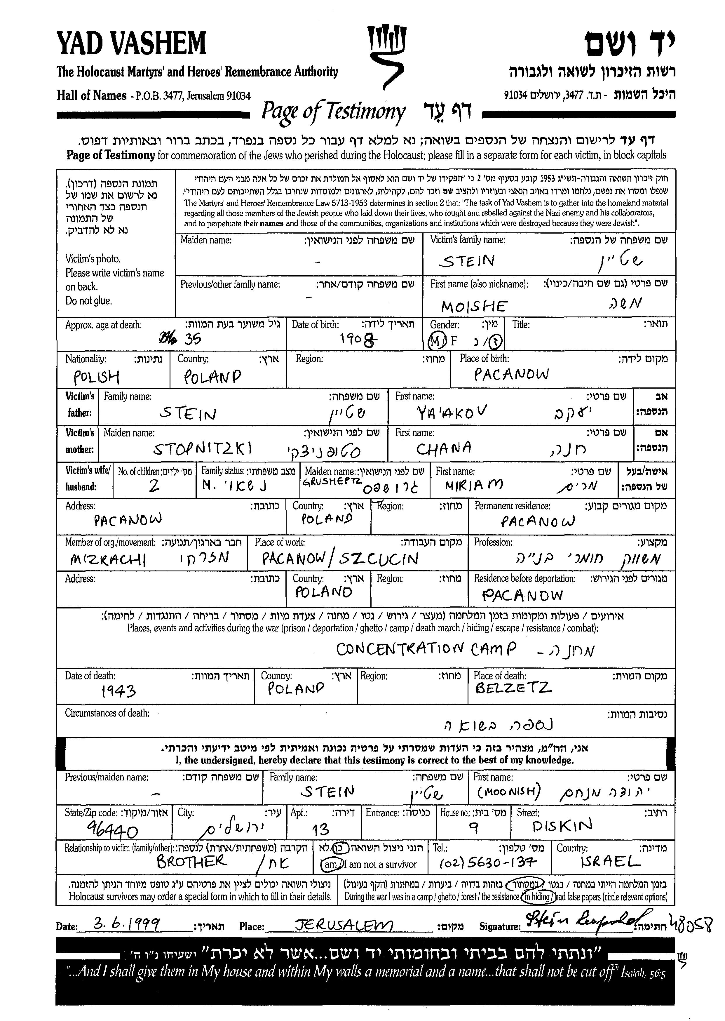 Moshe Zeev Stein wurde im Jahr 1908 in Pacanow, Polen geboren. Vor dem Zweiten Weltkrieg lebte er in Pacanow, Polen.