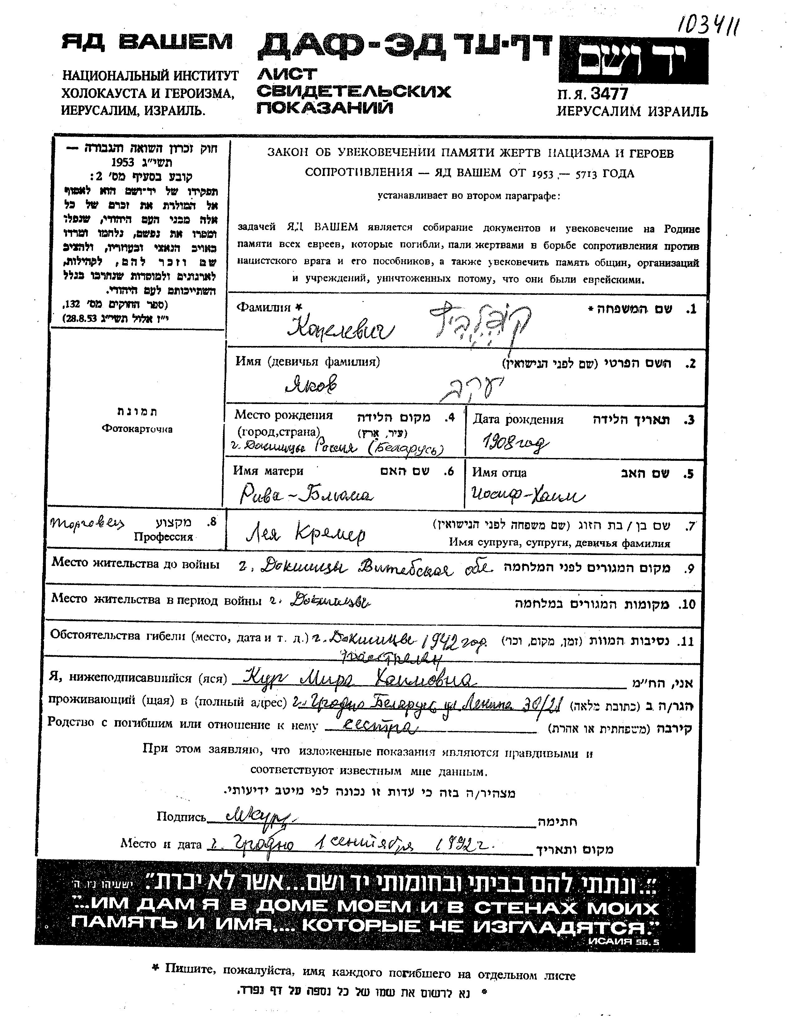 Yaakov wurde in der Schoah ermordet. Todesort: Dokszyce, Polen im Jahr 1942.