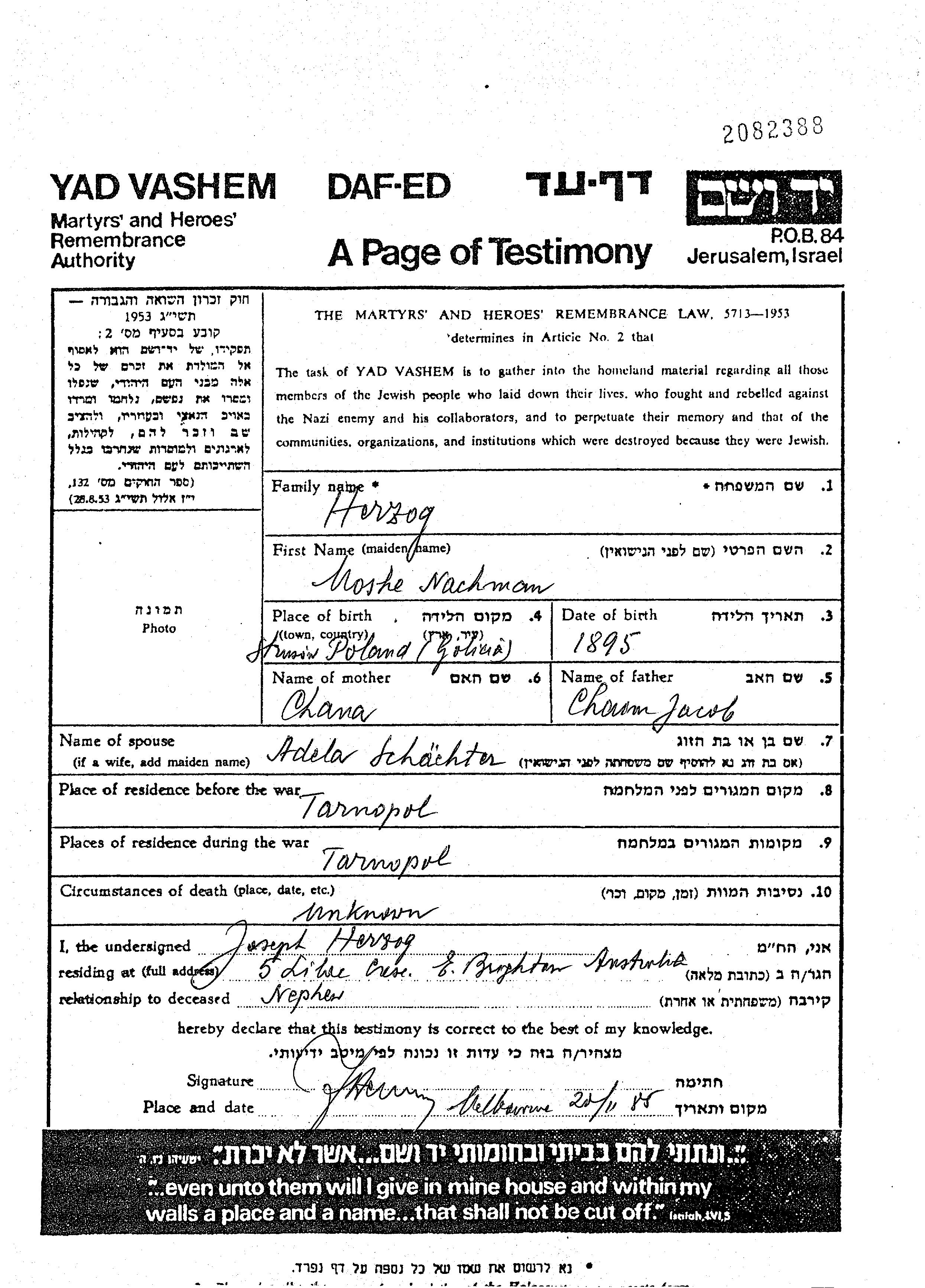 Herzog | Nachman Moshe | 1895 | Tarnopol, Polen | Gedenkblatt |