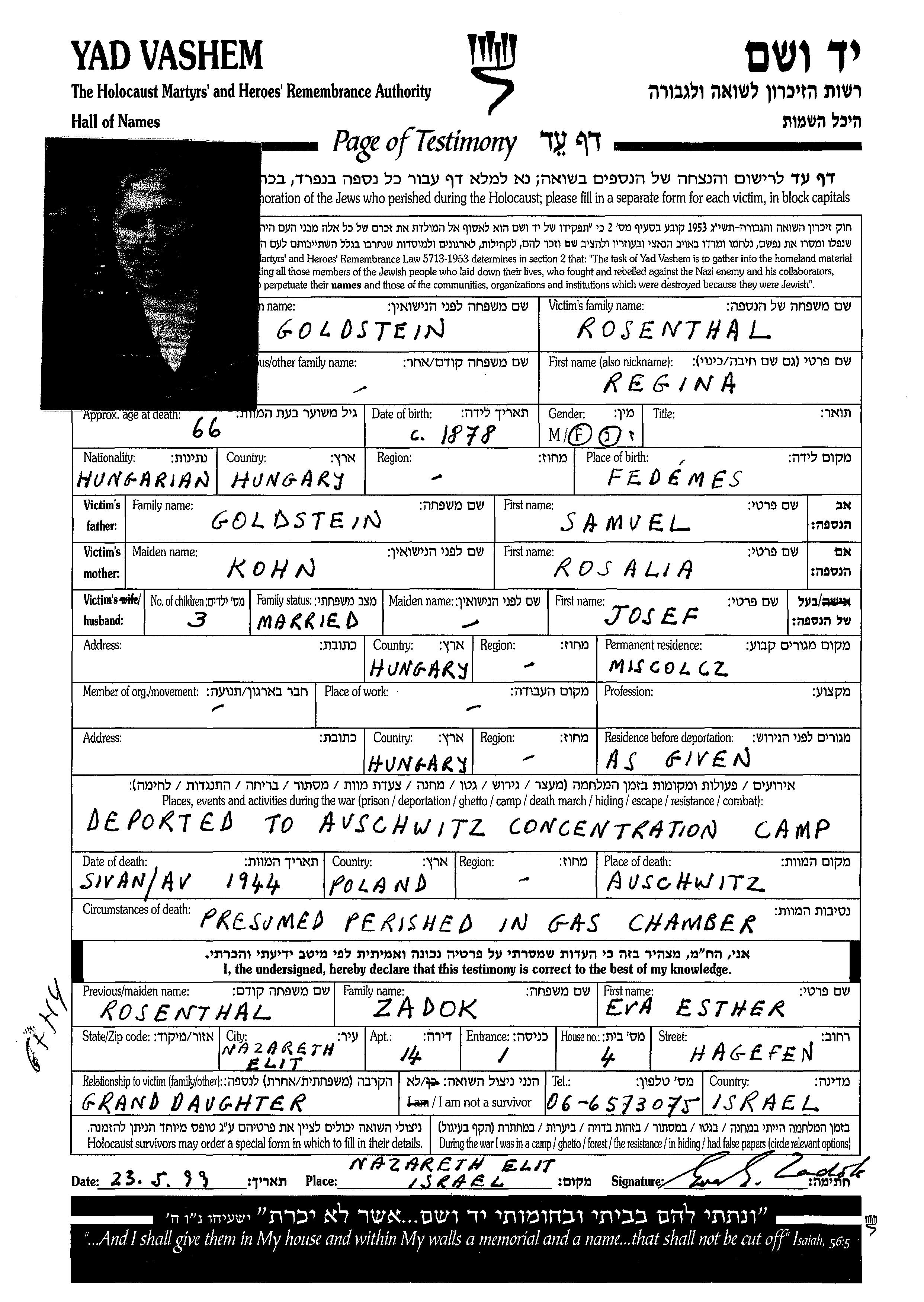 Regina Rosenthal, geb. Goldstein wurde im Jahr 1878 in Fedemes, Ungarn geboren. Vor dem Zweiten Weltkrieg lebte sie in Miskolc, Ungarn.