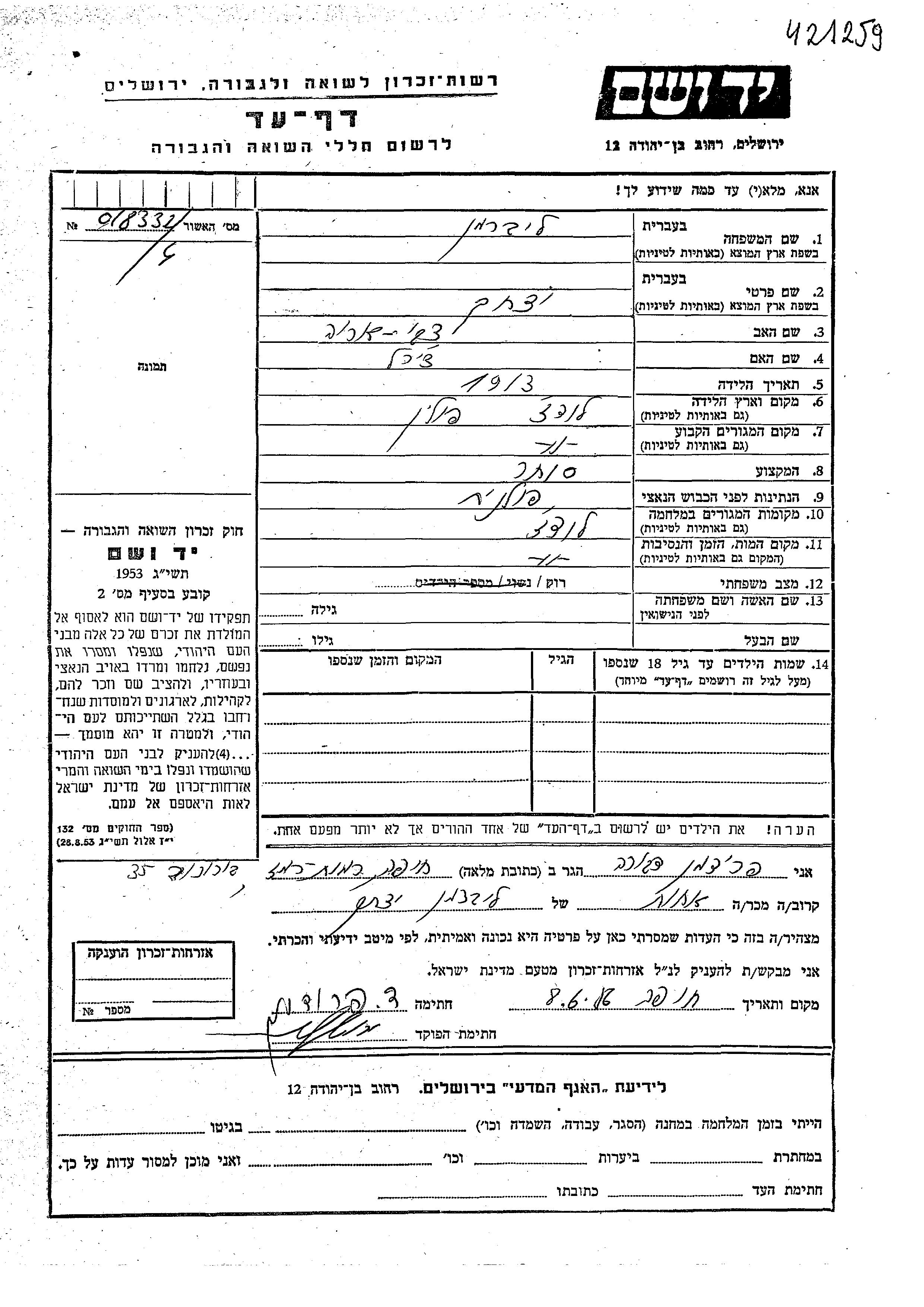 Liberman Yitzkhak 1913 Lodz, Polen Gedenkblatt