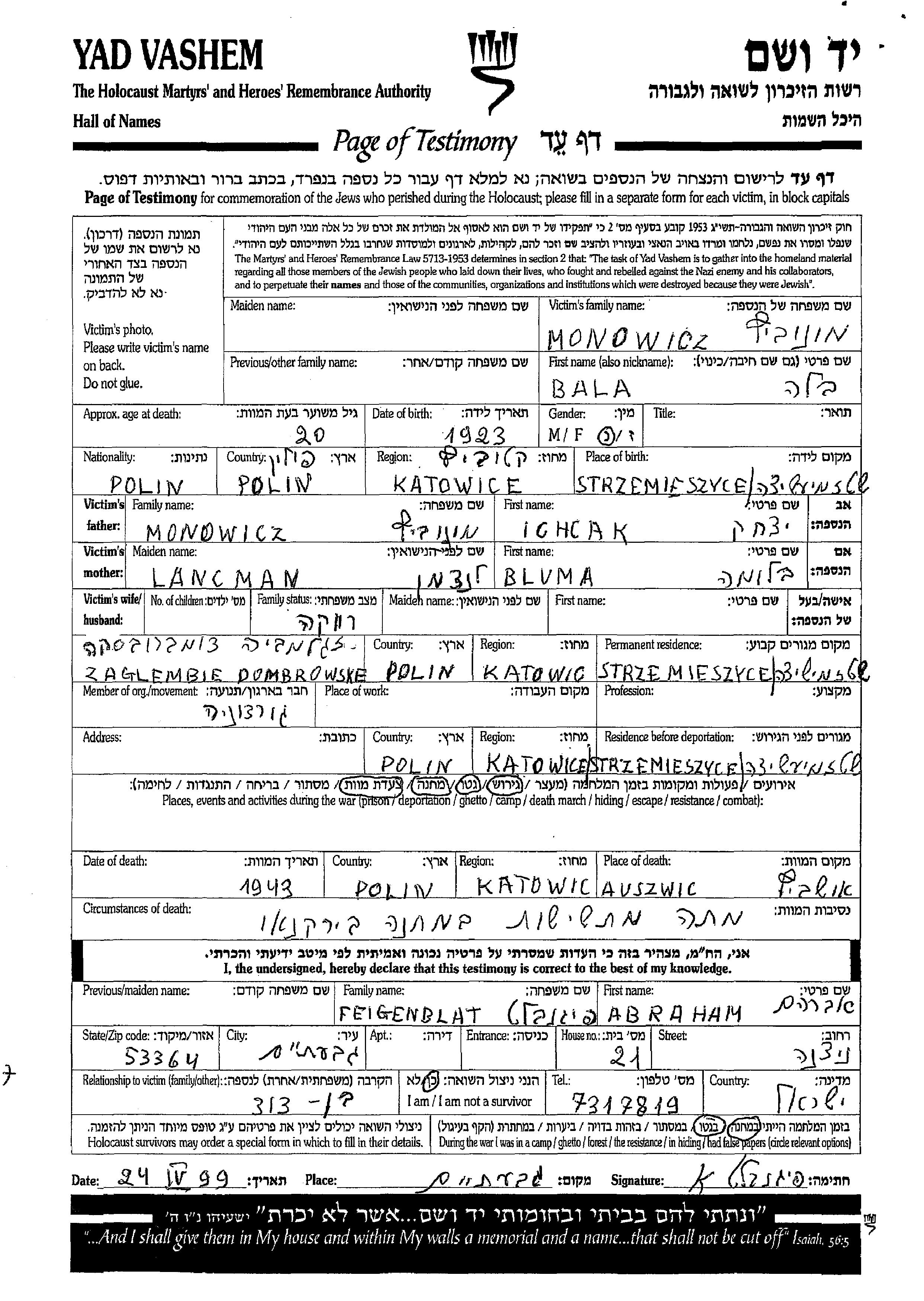 Bela Monowic wurde im Jahr 1923 in Strzemiesyce, Polen geboren. Sie war Schüler/-in. Vor dem Zweiten Weltkrieg lebte sie in Strzemiesyce, Polen.