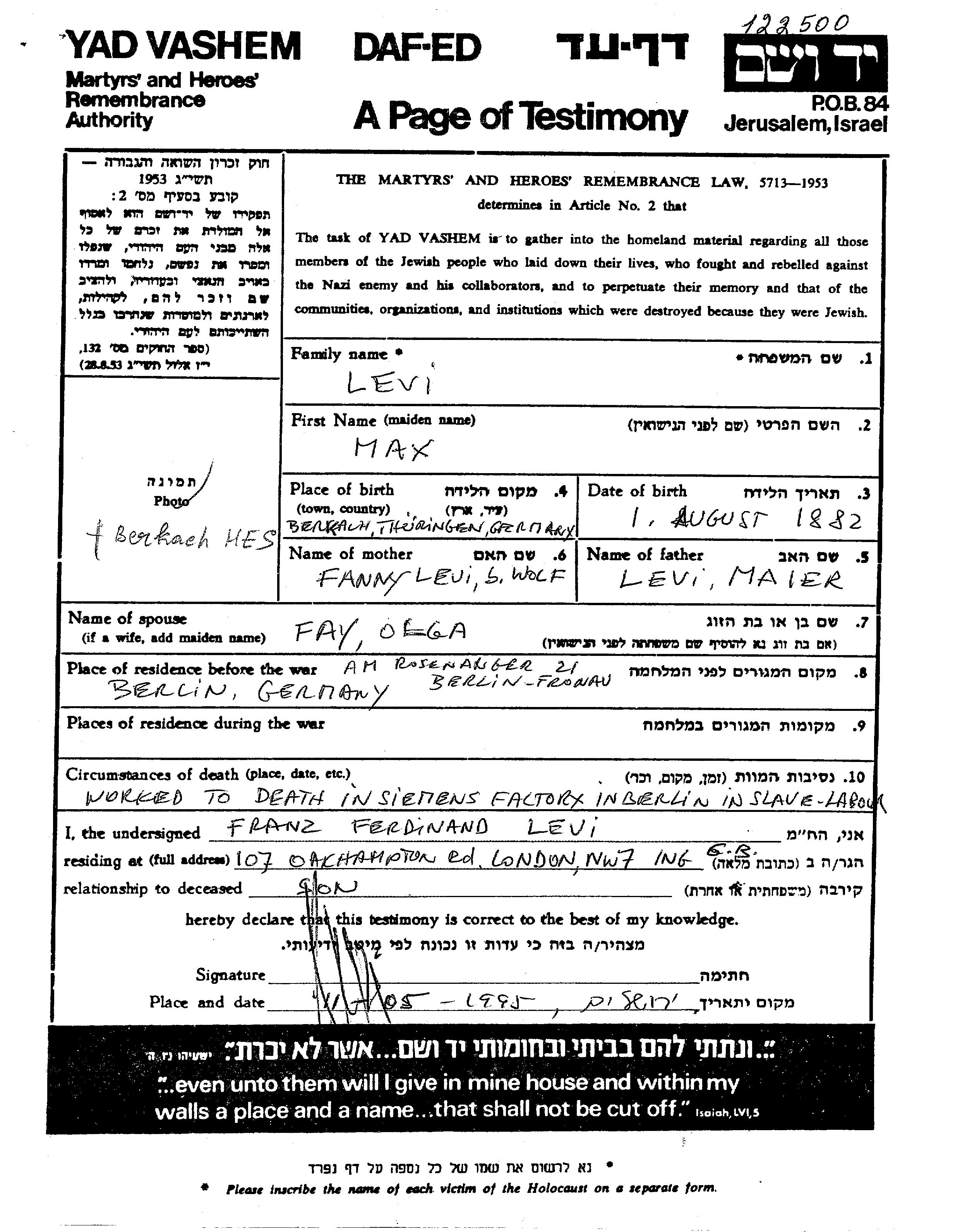 Max Levi wurde im Jahr 1882 in Berkach, Deutsches Reich geboren. Vor dem Zweiten Weltkrieg lebte er in Berlin, Deutsches Reich.