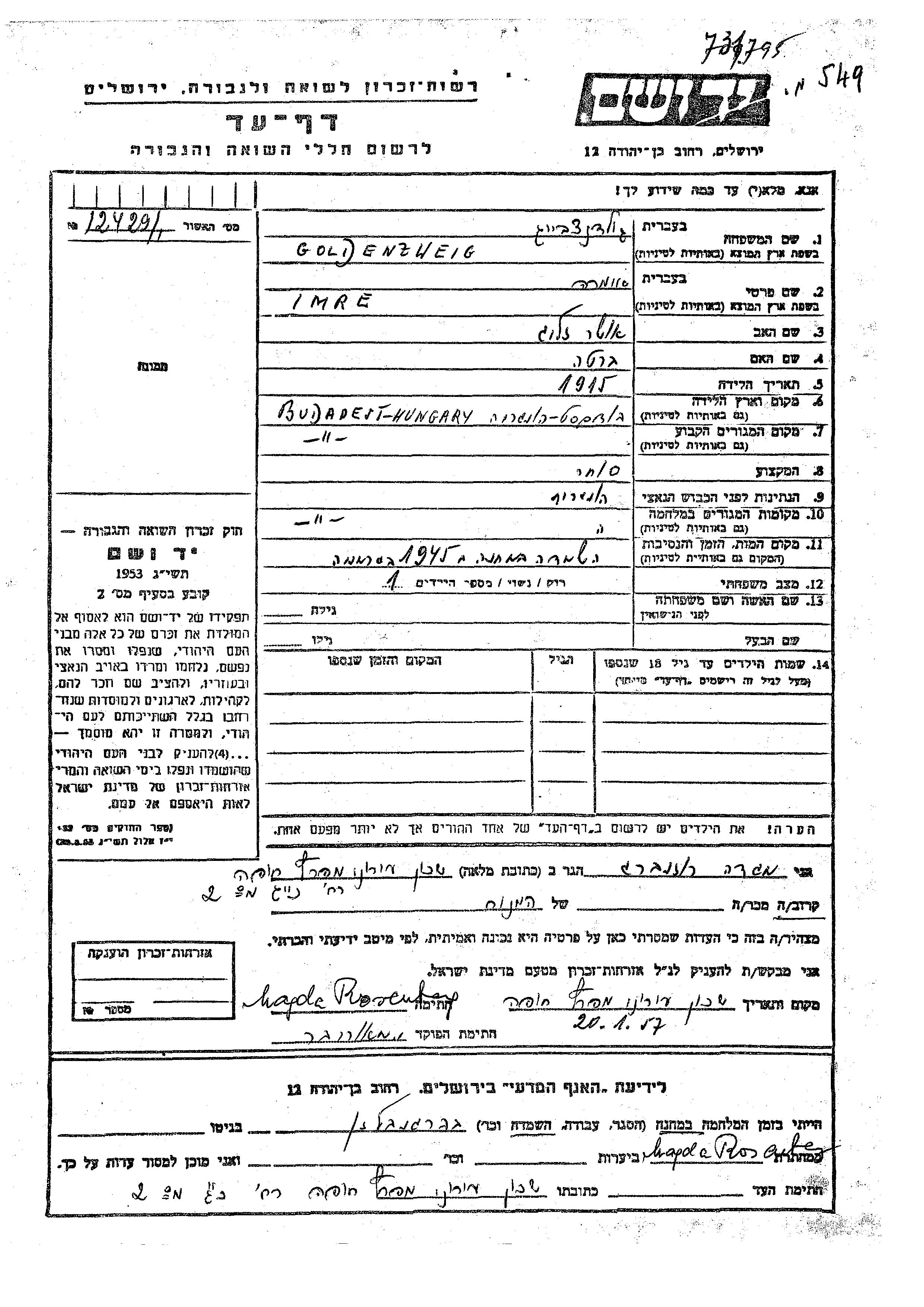 Imre wurde in der Schoah ermordet. Todesort: unbekannter Ort im Jahr 1945.