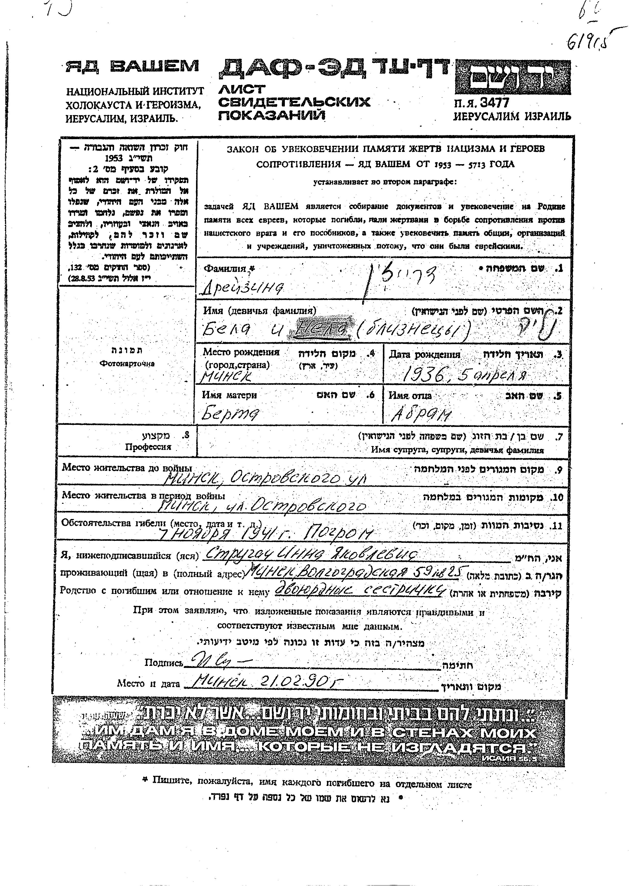 Nela Dreizin wurde im Jahr 1936 in Minsk, Weißrussland (UdSSR) geboren. Vor dem Zweiten Weltkrieg lebte sie in Minsk, Weißrussland (UdSSR).