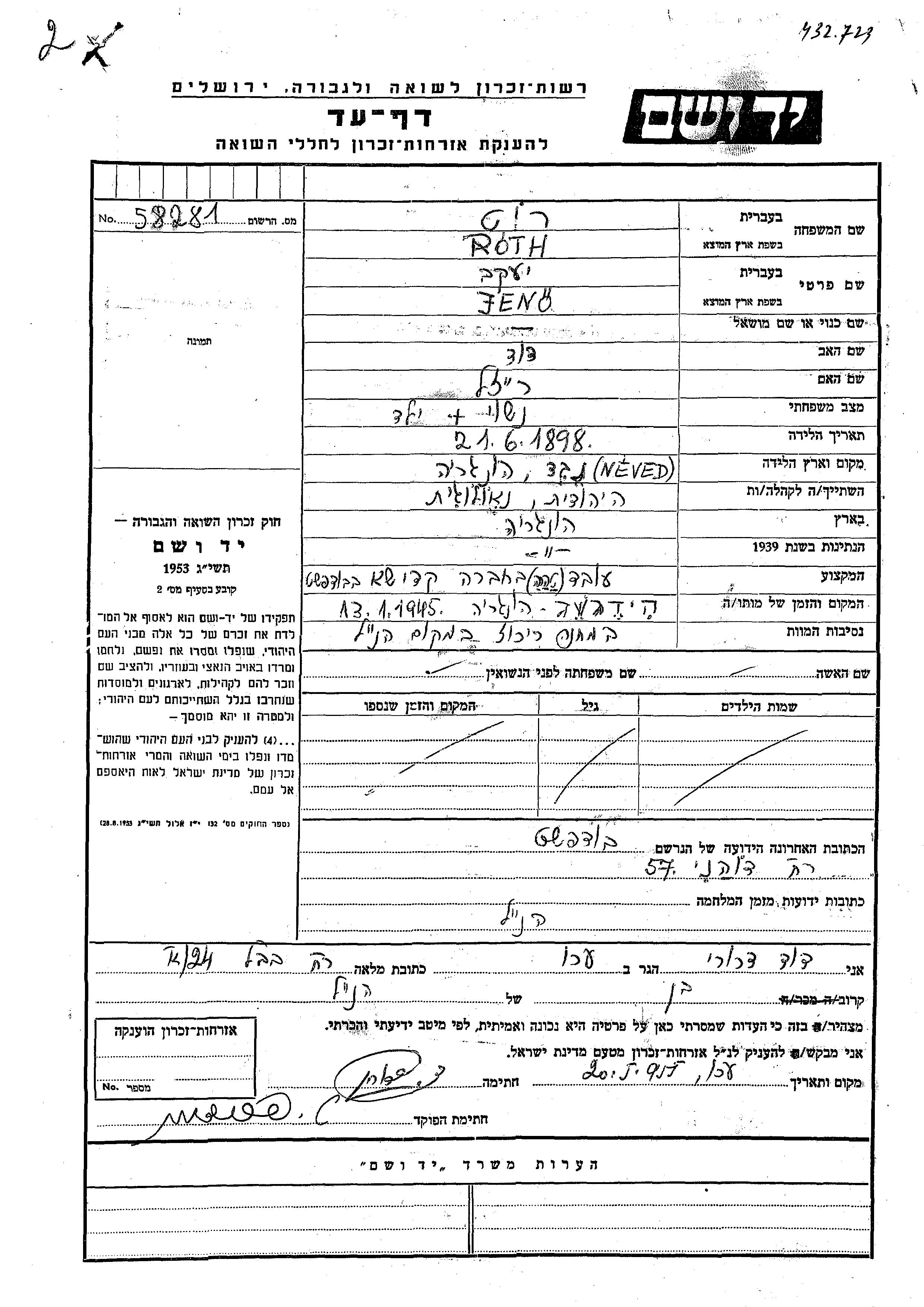 Roth Rut Jeno Yaakov 1898 Budapest, Ungarn Gedenkblatt