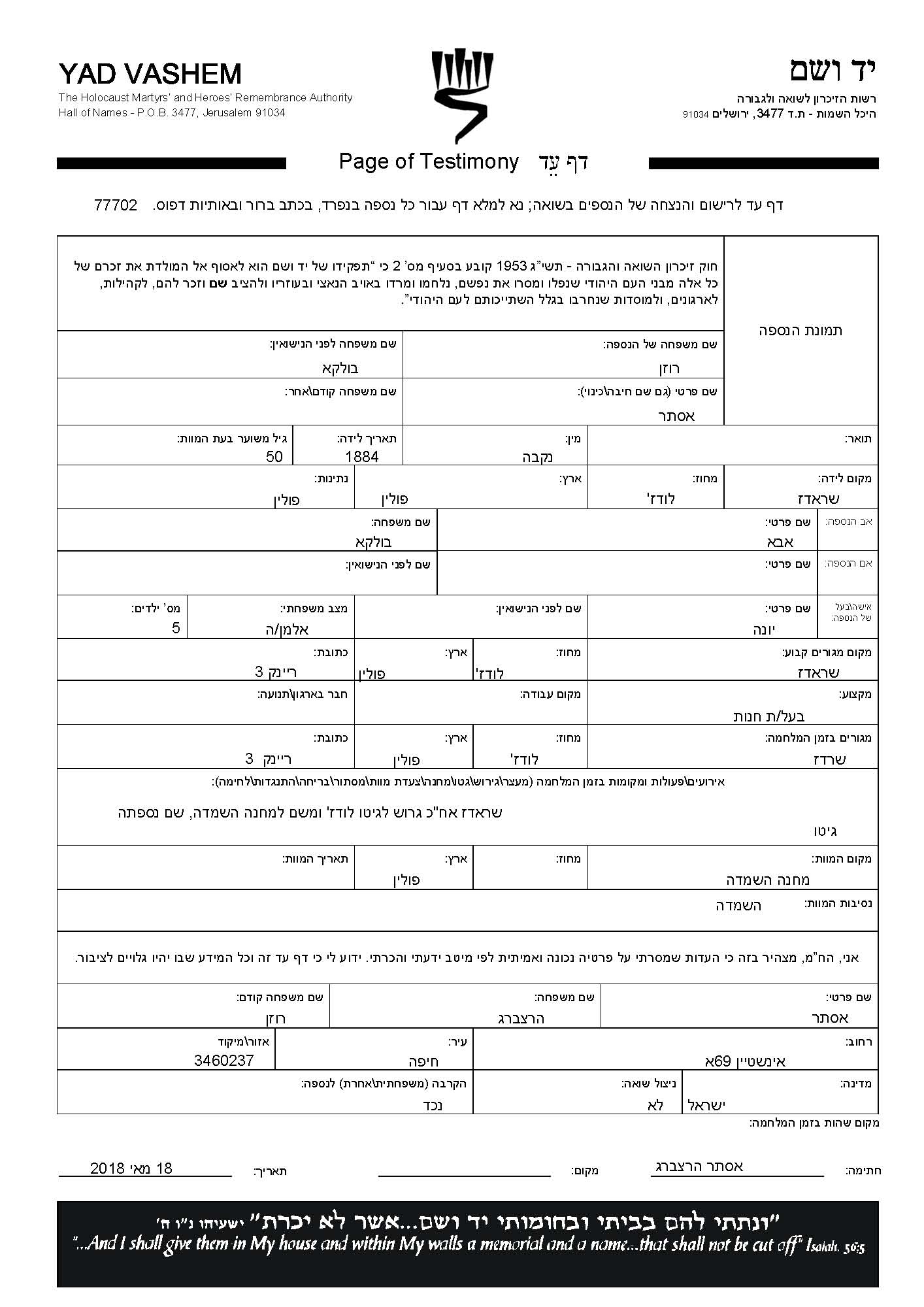 Ester Rosen, geb. Bulka wurde im Jahr 1884 in Sieradz, Polen geboren. Vor dem Zweiten Weltkrieg lebte sie in Sieradz, Polen.