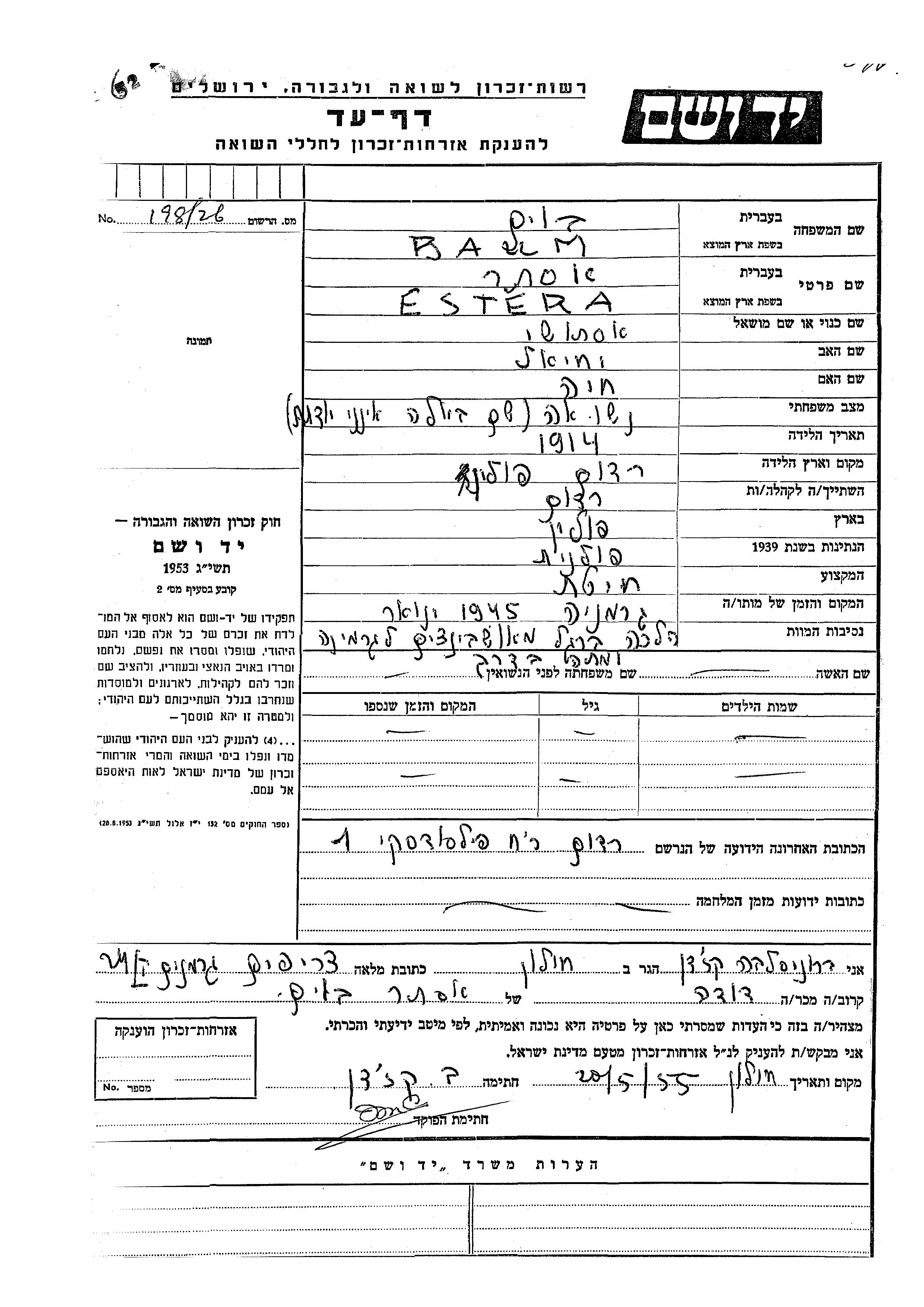 Ester Opatovska Baum wurde im Jahr 1914 in Radom, Polen geboren. Sie war Schneider. Vor dem Zweiten Weltkrieg lebte sie in Radom, Polen.
