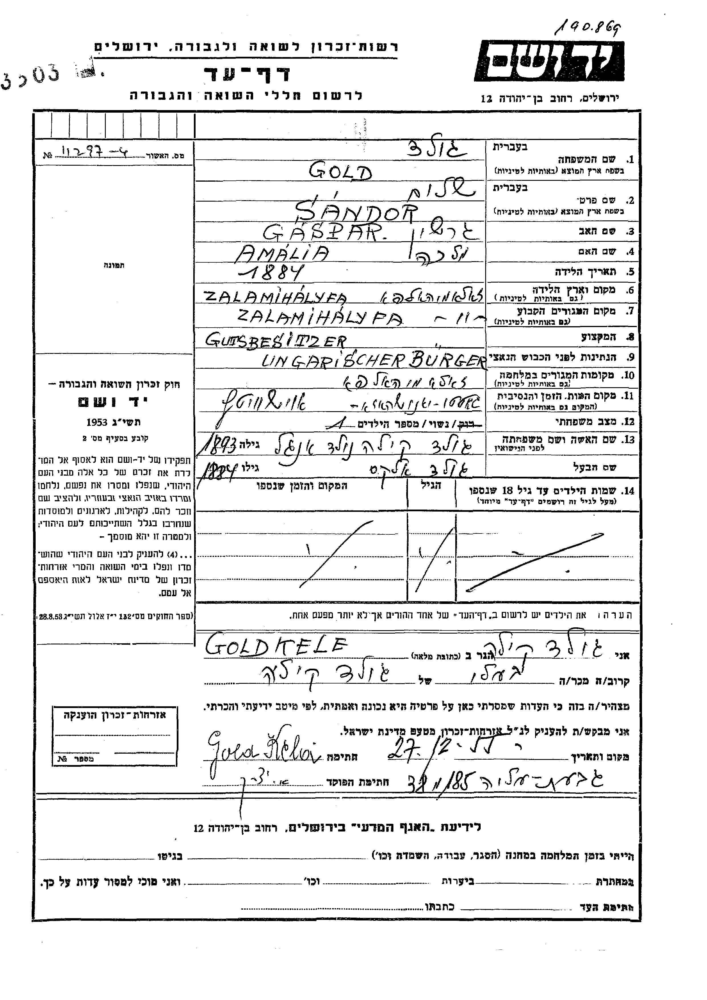 Sandor Shalom Gold wurde im Jahr 1884 in Zalamihalyfalva, Ungarn geboren. Er war der Sohn von Gaspar Gershon und Amalia Malka. Er war Gutsbesitzer und mit Keila, geb. Angel Verheiratet. Vor dem Zweiten Weltkrieg lebte er in Zalamihalyfalva, Ungarn.