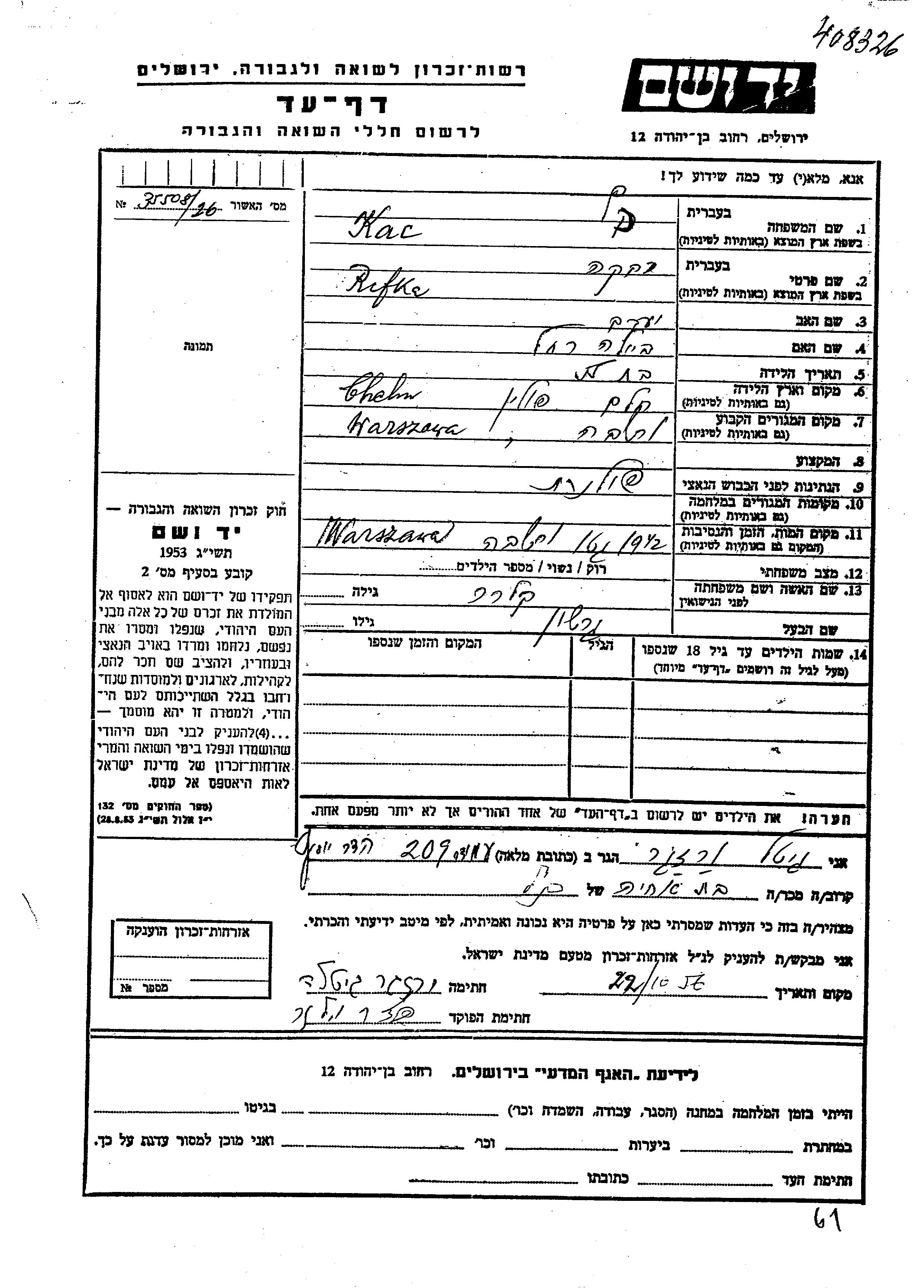 Rivka Kac Kotz, geb. Klerer wurde in Chelm, Polen geboren. Sie war Hausfrau. Vor dem Zweiten Weltkrieg lebte sie in Warszawa, Polen.