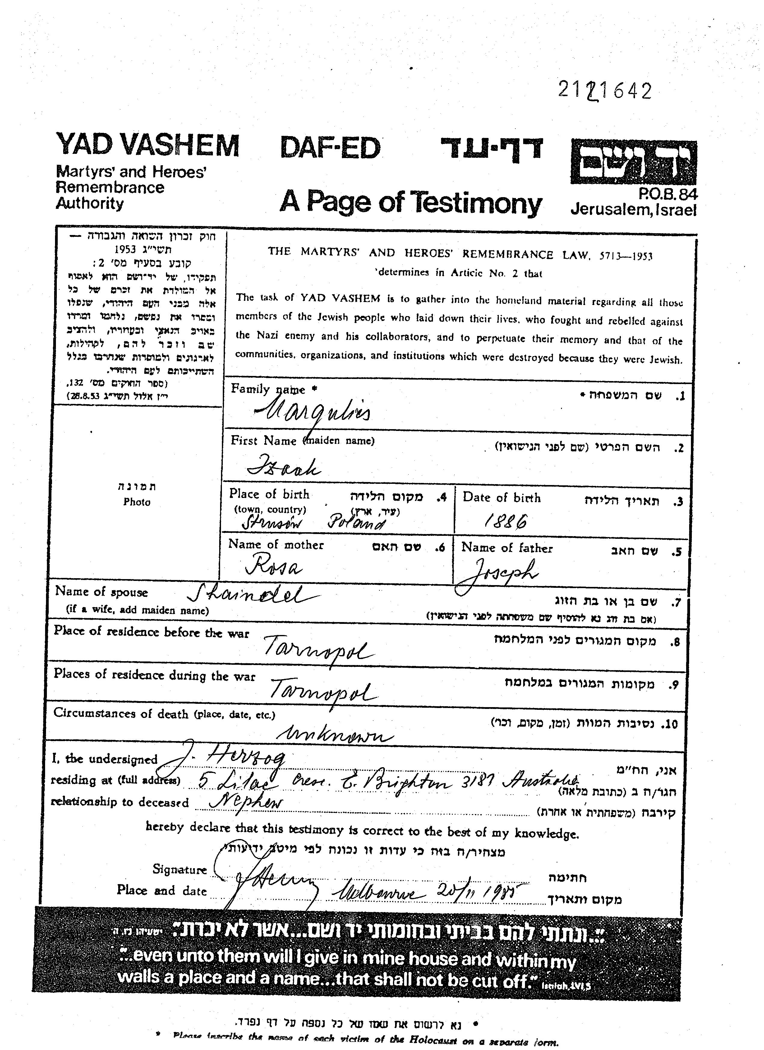 Yitzkhak Margulies wurde im Jahr 1886 in Strusow, Polen geboren. Vor dem Zweiten Weltkrieg lebte er in Tarnopol, Polen.