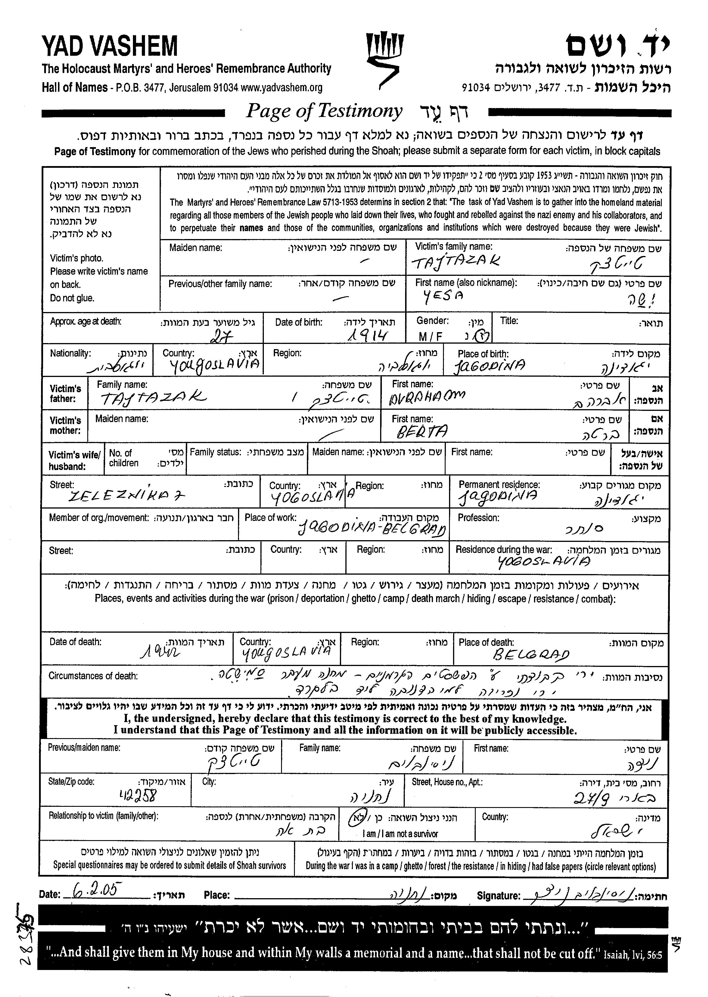 Jesha Iasha Tajtacak wurde im Jahr 1914 in Jagodina, Jugoslawien geboren. Er war Angestellte/-r. Vor dem Zweiten Weltkrieg lebte er in Jagodina, Jugoslawien.