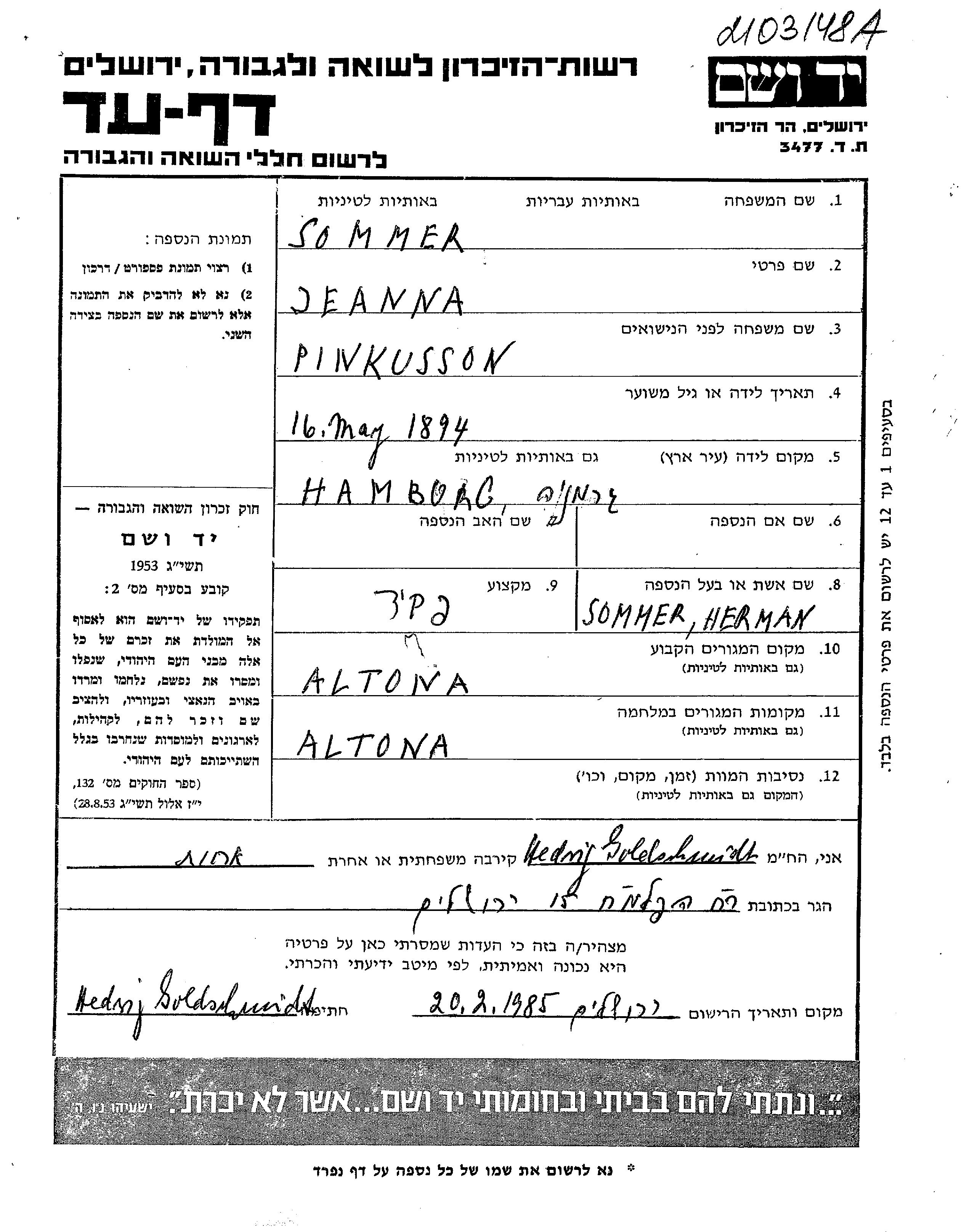 Zhana Sommer, geb. Pinkusson wurde im Jahr 1894 in Hamburg, Deutsches Reich geboren. Sie war Buchhalter/-in. Vor dem Zweiten Weltkrieg lebte sie in Altona, Deutsches Reich.