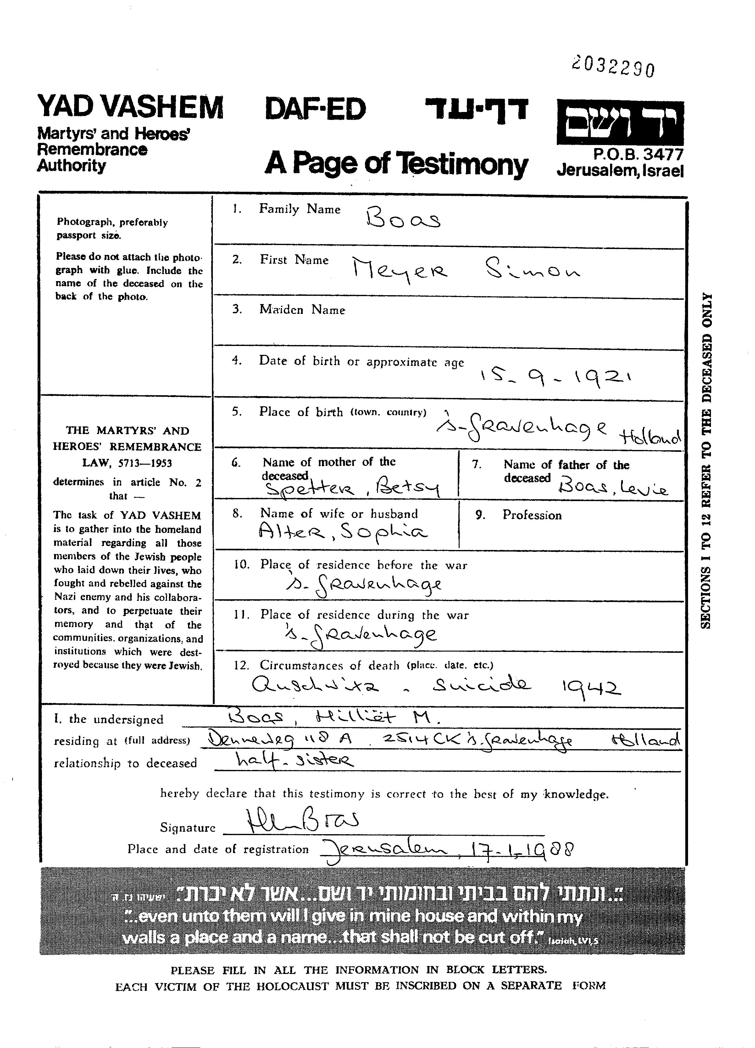 Meir Shimon Boaz wurde im Jahr 1921 geboren. Vor dem Zweiten Weltkrieg lebte er in S Gravenhage, Niederlande.