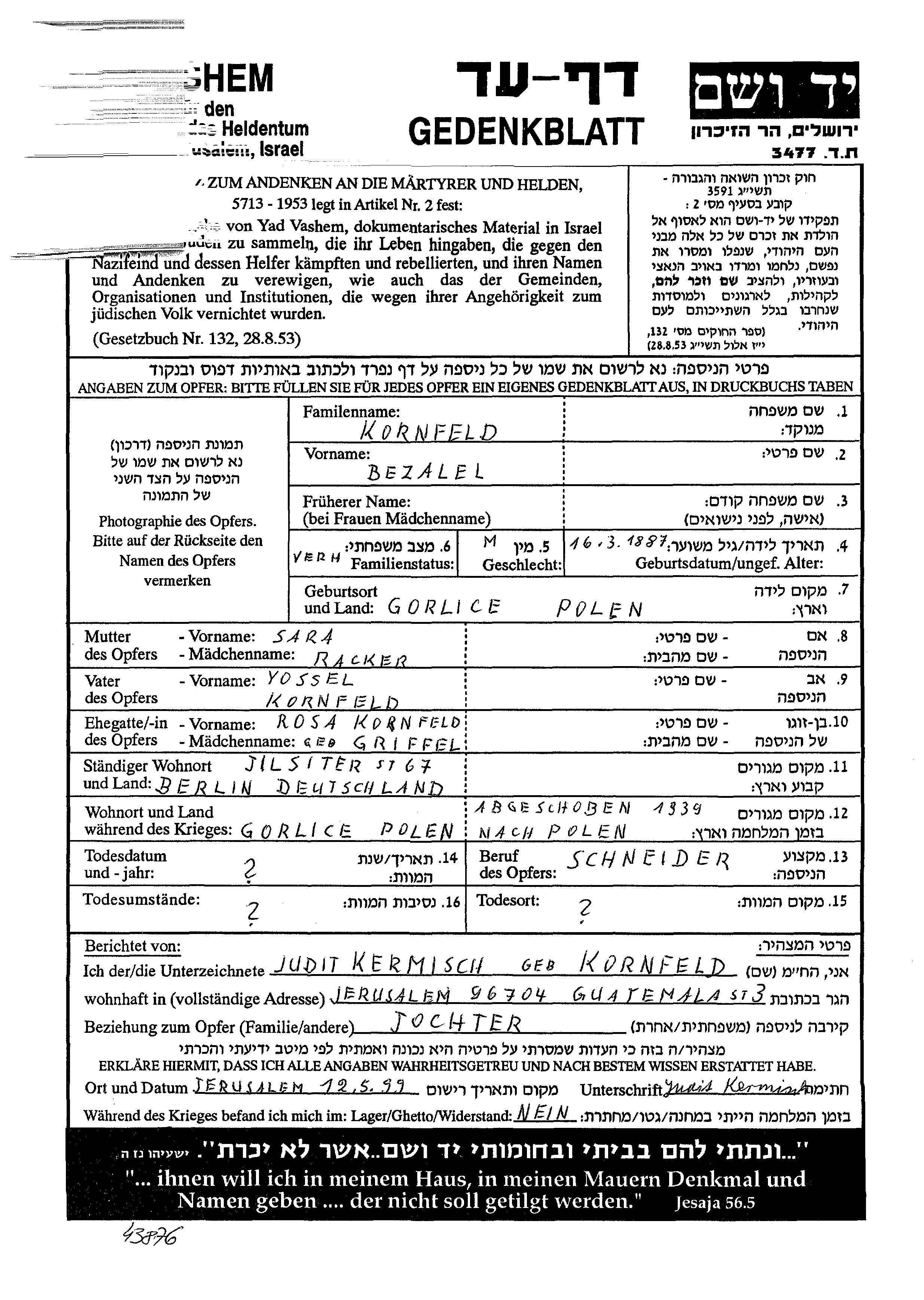 Kornfeld Betzalel 1887 Berlin, Deutsches Reich Gedenkblatt