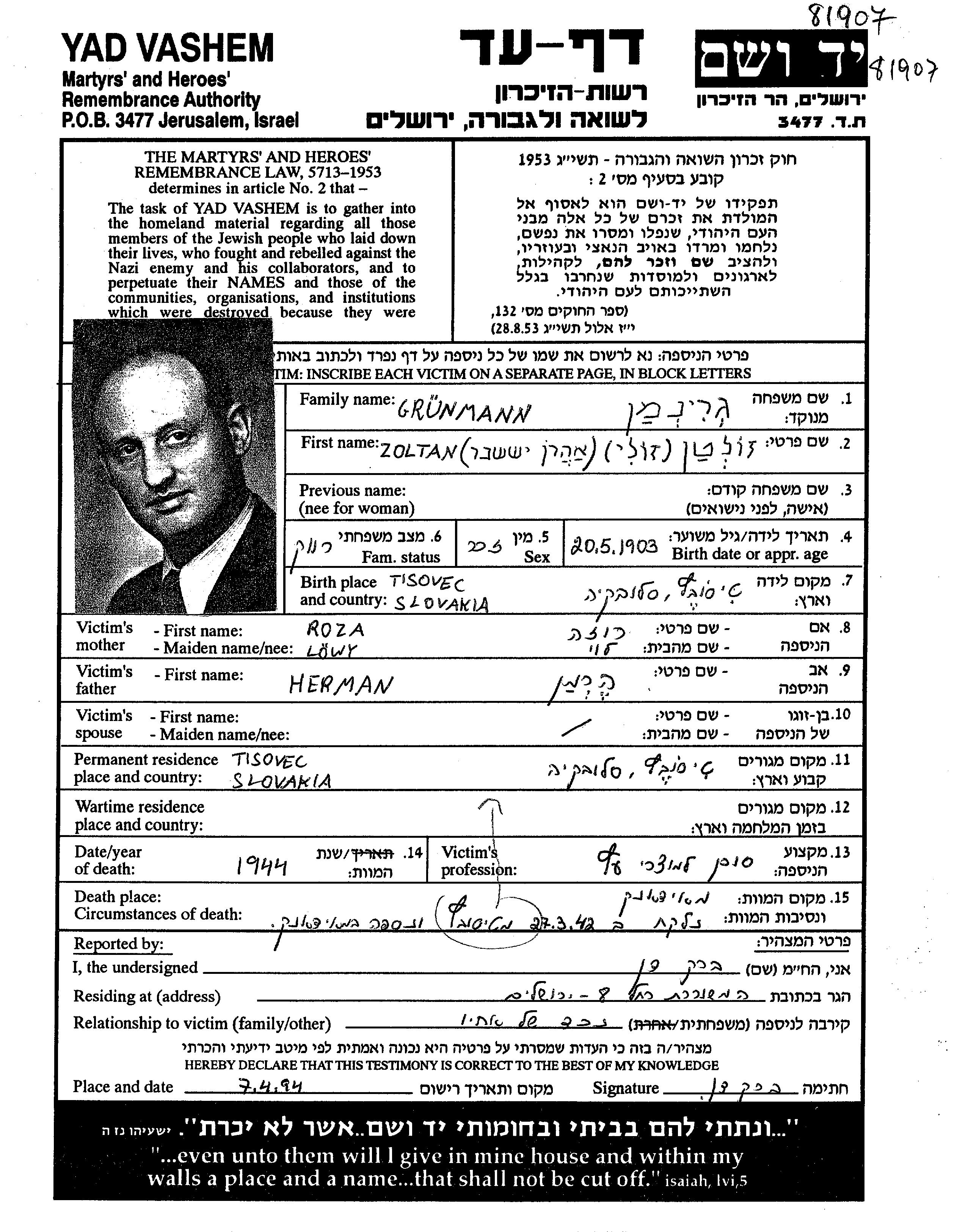 Grünmann Zoli Aharon 1903 Tisovec, Tschechoslowakei Gedenkblatt