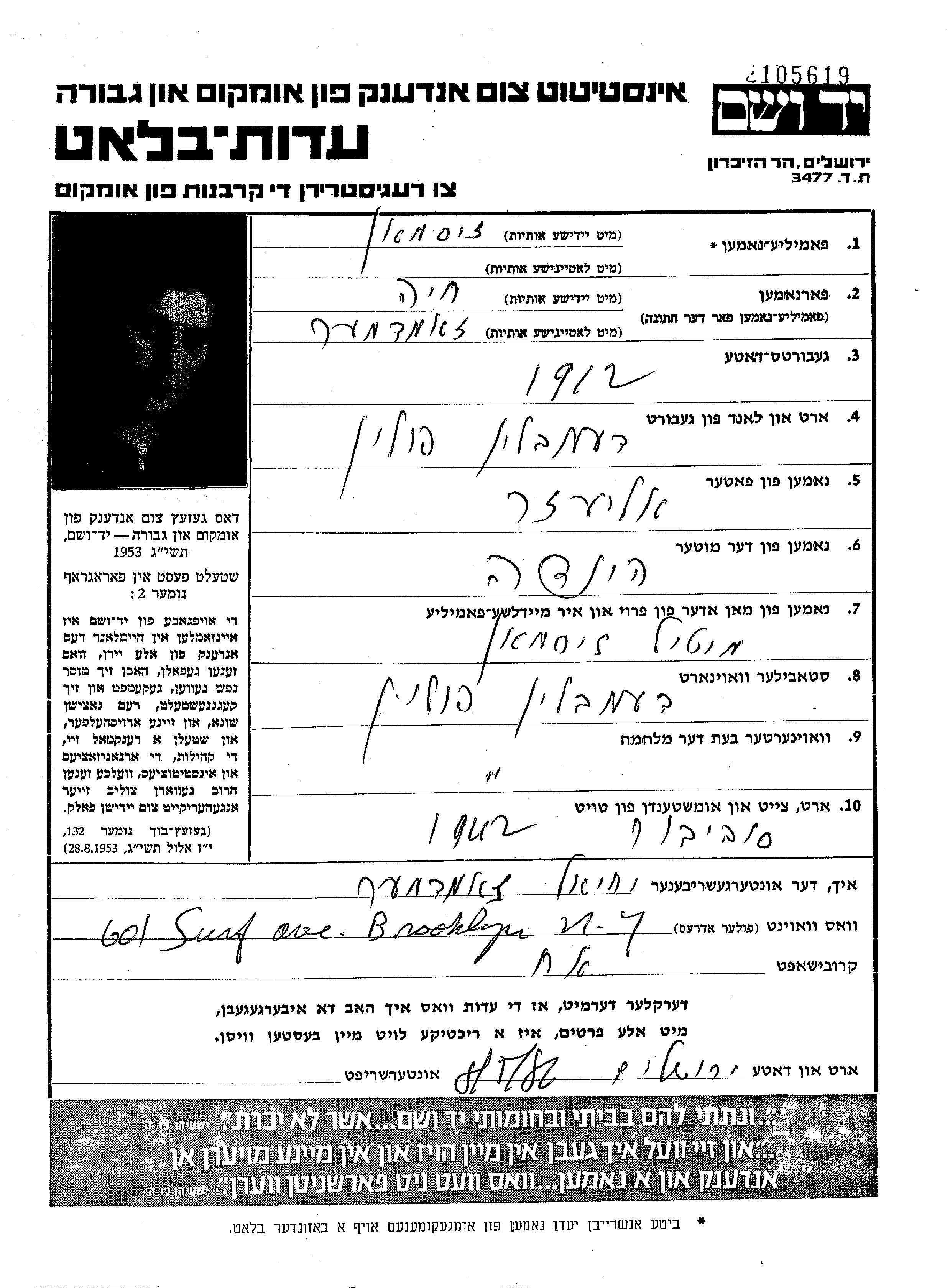 Zisman Haia 1910 Demblin, Polen Gedenkblatt