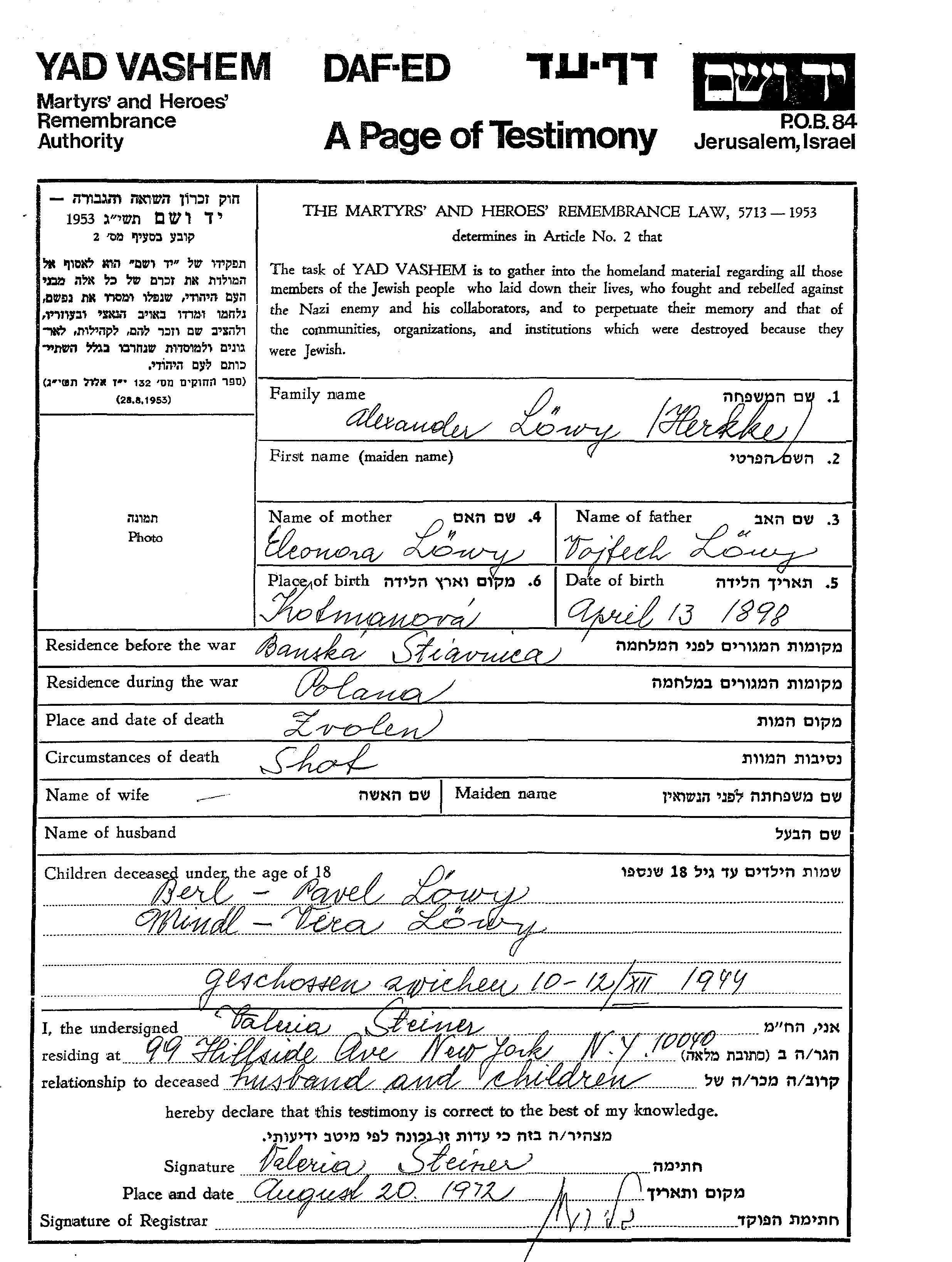 Alexander Löwy Herzke wurde im Jahr 1898 in Kotmanova, Tschechoslowakei geboren. Vor dem Zweiten Weltkrieg lebte er in Banska Stiavnica, Tschechoslowakei.
