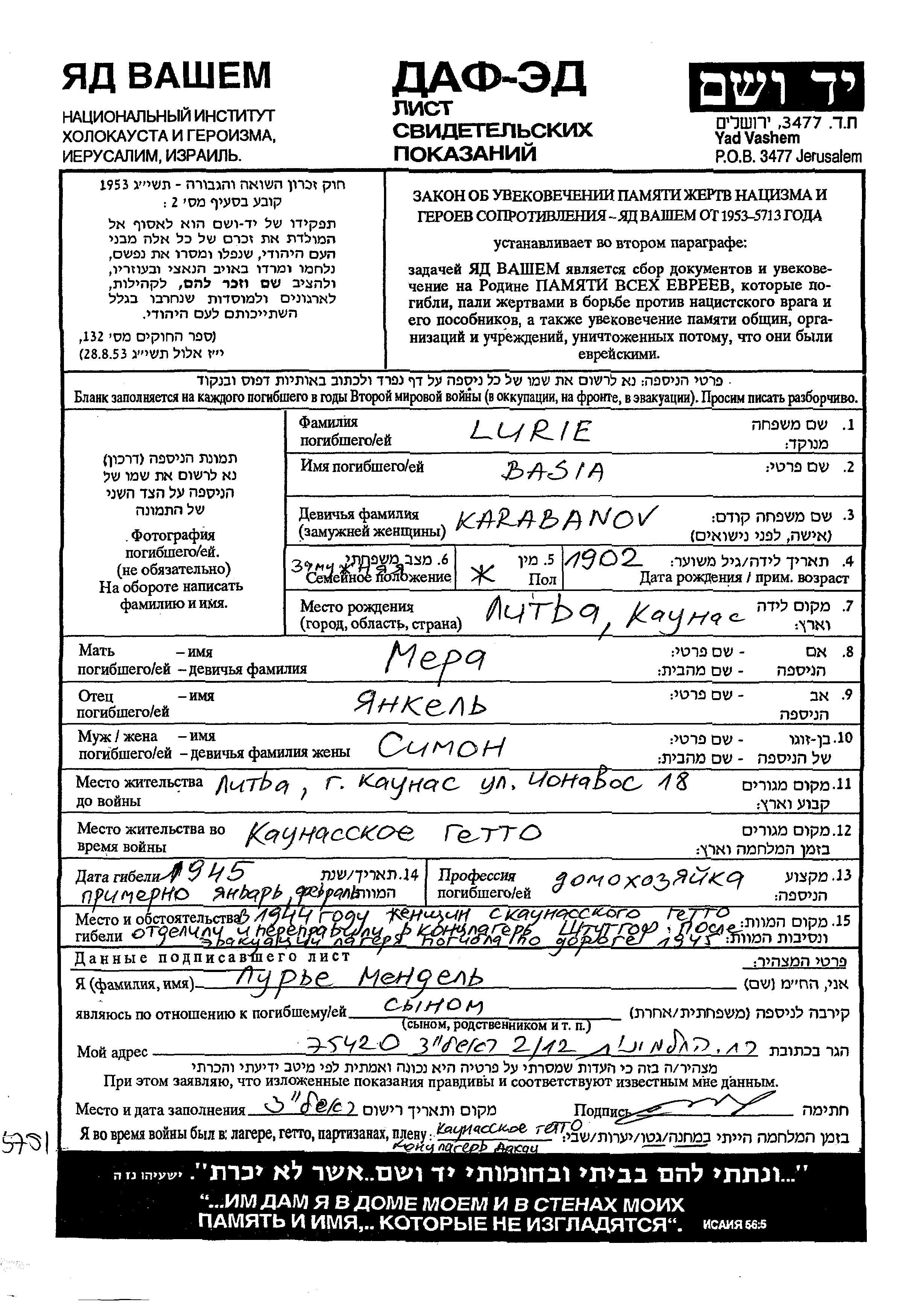 Batia Lurie, geb. Karabanof wurde im Jahr 1902 geboren. Sie war Hausfrau. Vor dem Zweiten Weltkrieg lebte sie in Kaunas, Litauen.