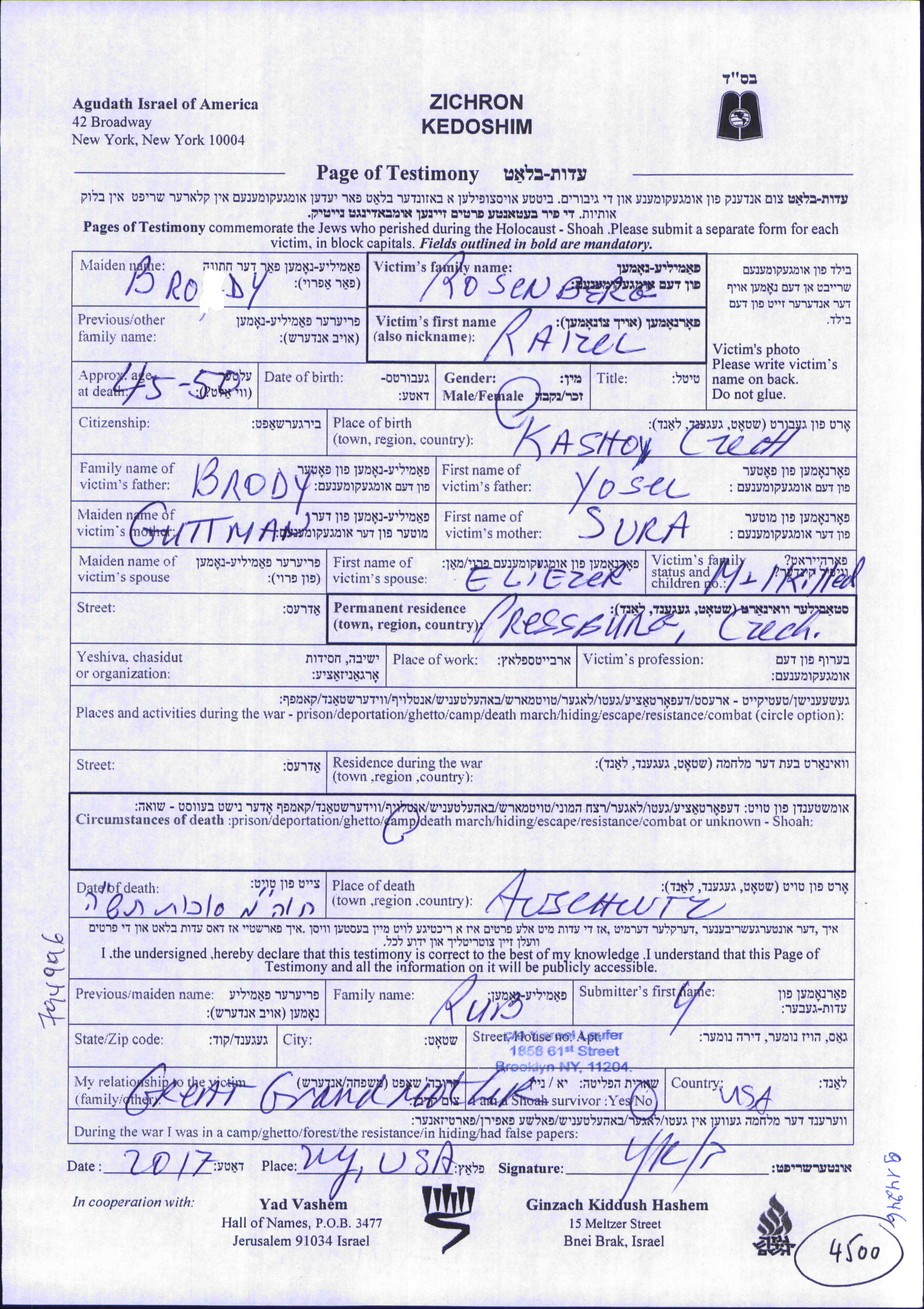 Rozenberg Halevi Reizel Pressburg, Tschechoslowakei Aufzeichnungen ueber ermordete Personen
