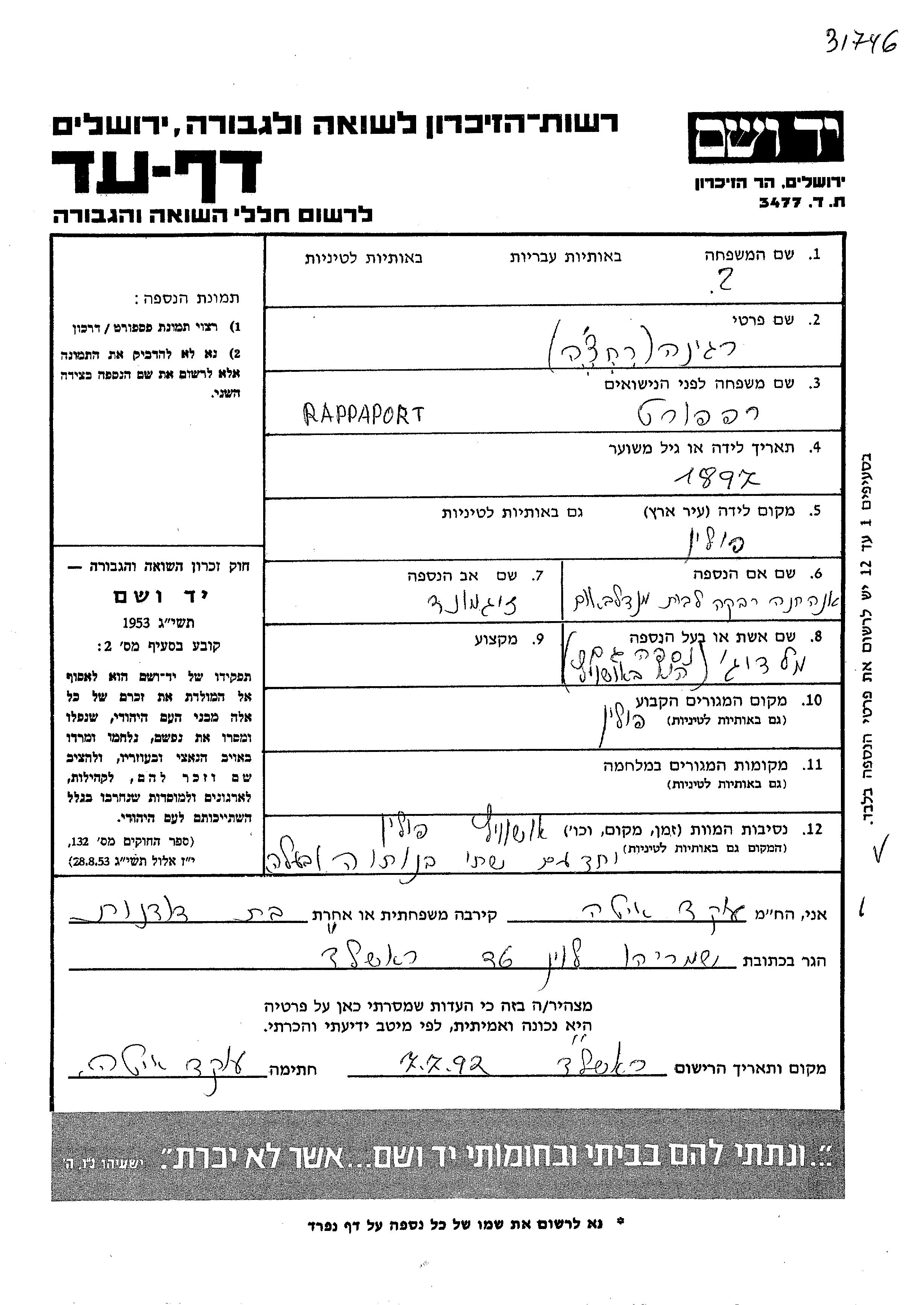 Regina Rakhel Name unbekannt, geb. Rappaport wurde im Jahr 1897 in Polen geboren. Vor dem Zweiten Weltkrieg lebte sie in Polen.