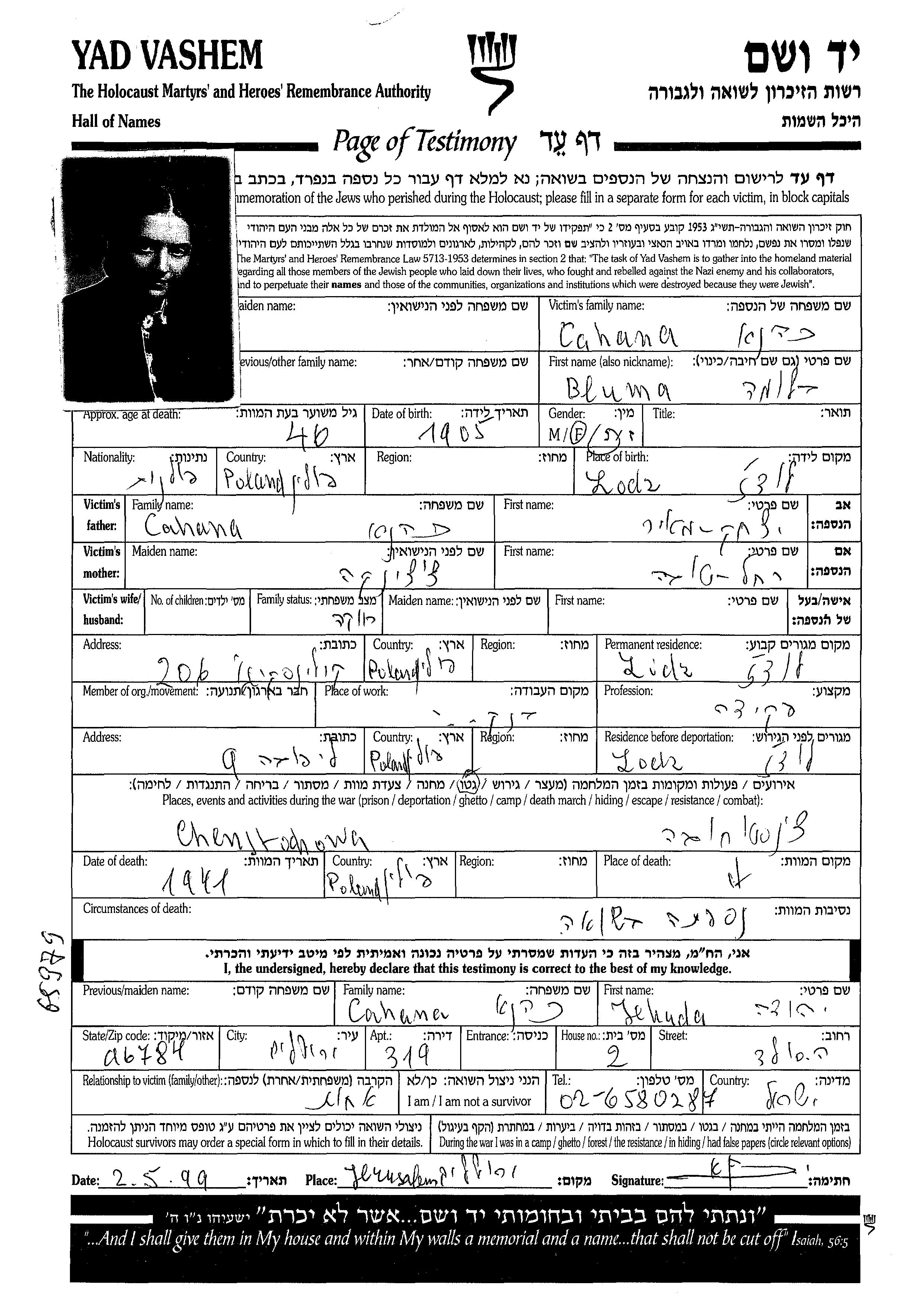 | Cahana | Bluma | 1905 | Lodz, Polen | Gedenkblatt |