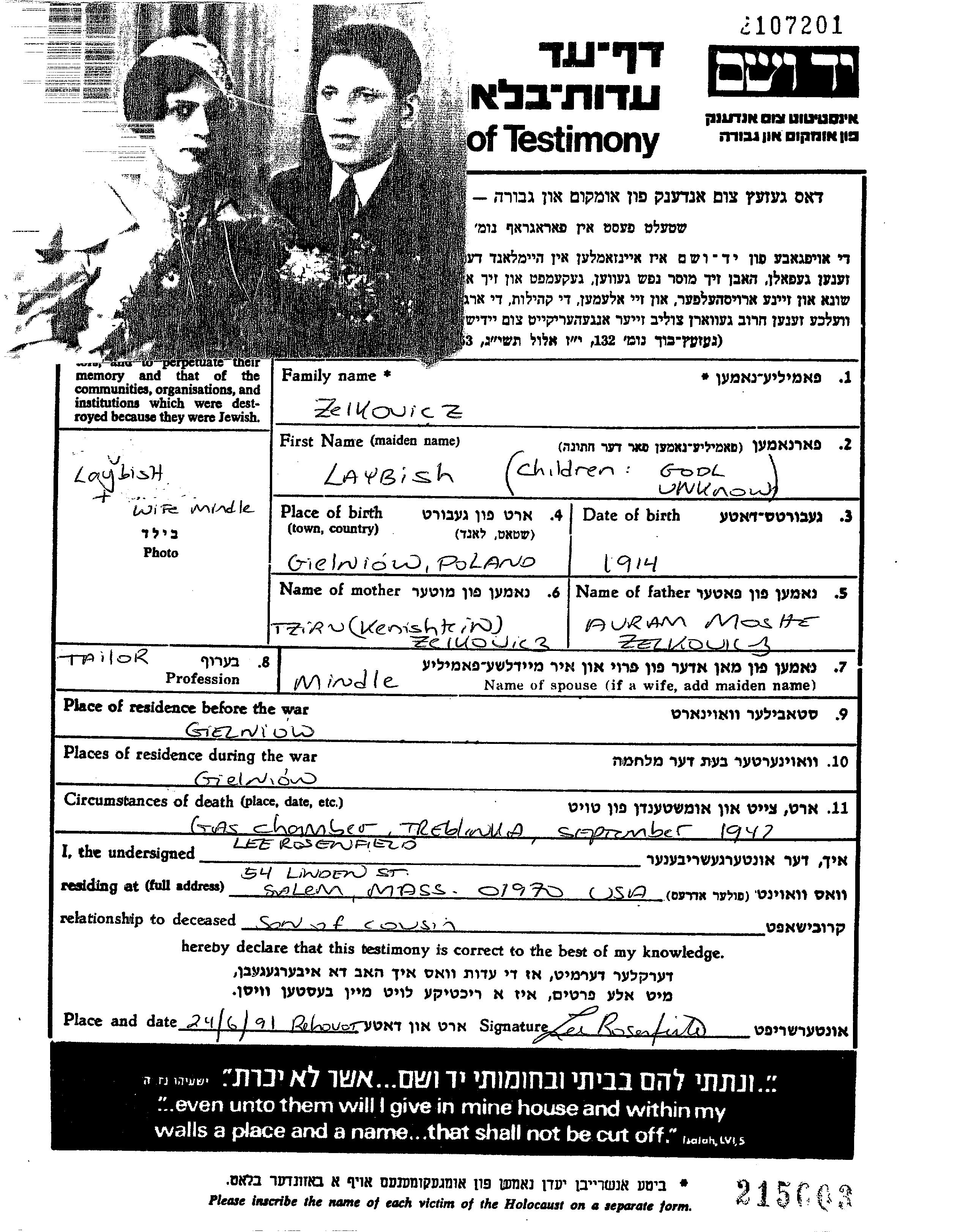 Zelkovicz | Laybish | 1914 | Gielniow, Polen | Gedenkblatt |